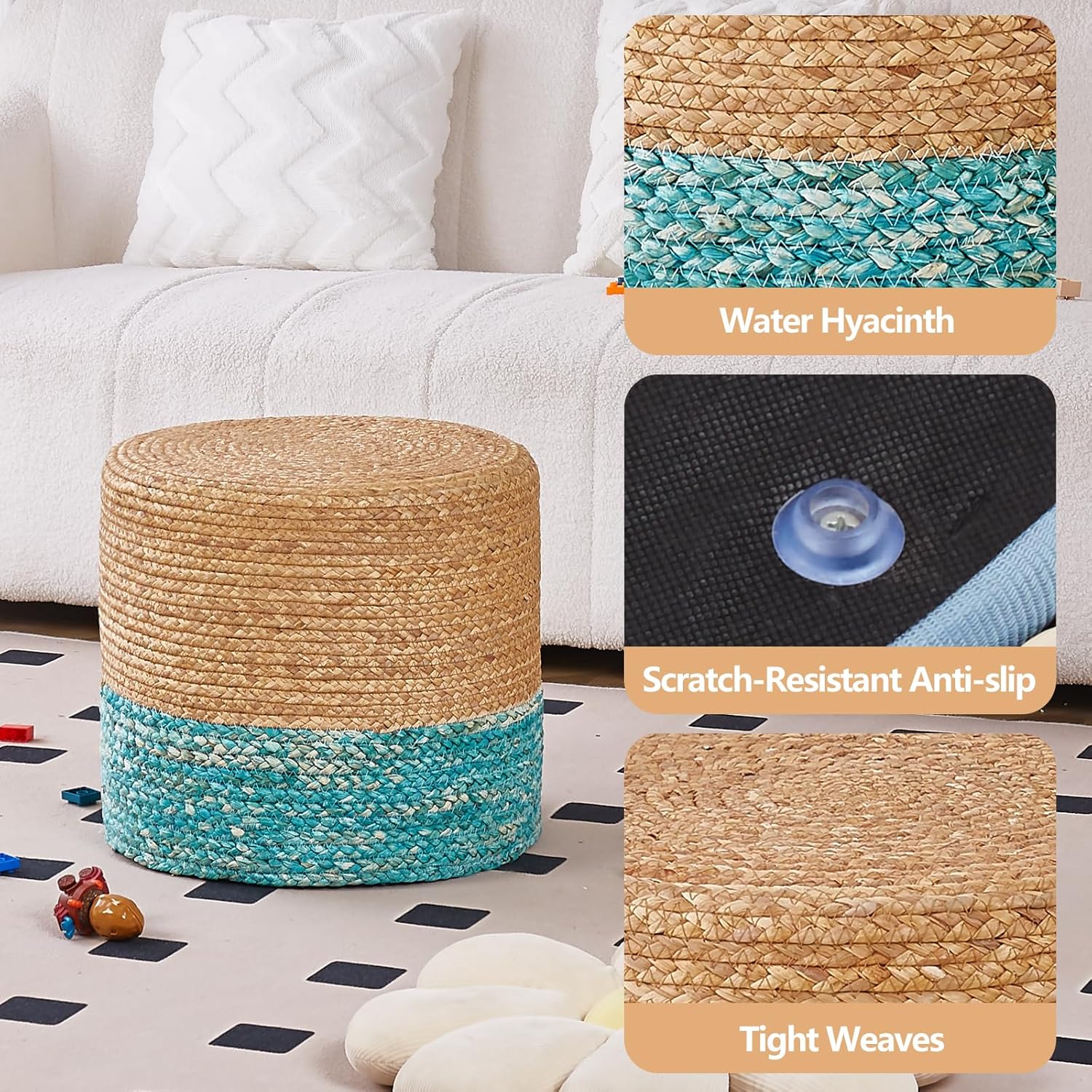 Wimarsbon 18'' Ottoman Pouf, Natural Braided Poof, Rustic Handweave Lounge Pouffe, Boho Footrest Stool for Bedroom, Accent Table for Living Room (Natural Water Hyacinth + Lake Blue Corn Husk)