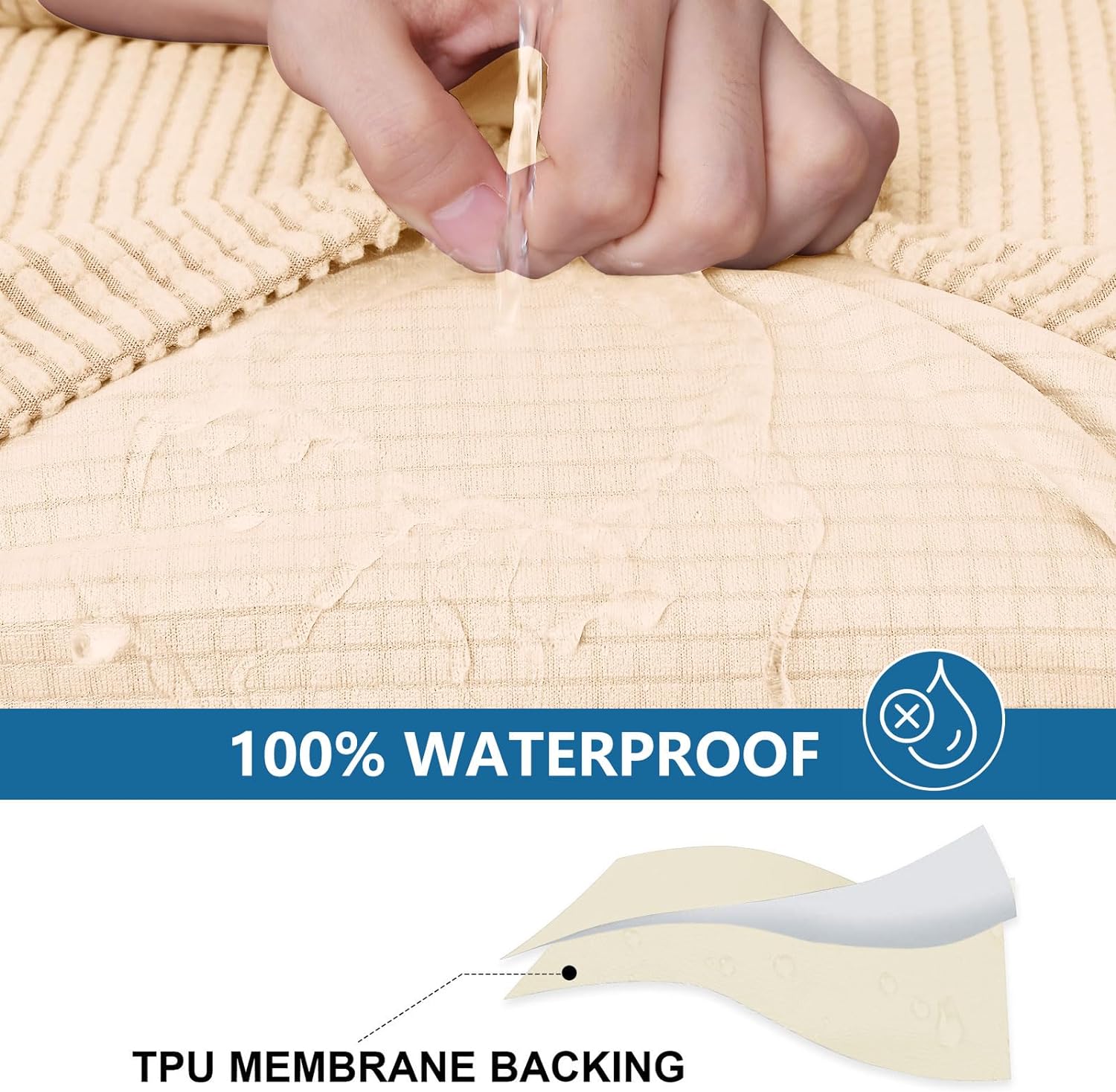 - [100% Waterproof Fabric] The back of the couch seat cover has a waterproof layer made of TPU. Great on against spills, pets' fur, stains, and normal wear and tear or any possible mess and accidents.