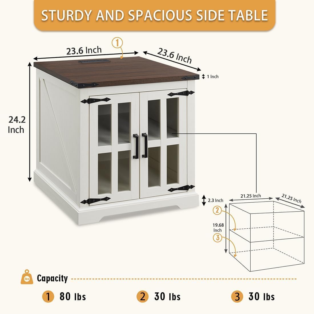 Farmhouse End Table with Charging Station,24" Large Sofa Side Table with Glass Barn Door, Rustic Wood Nightstand Bedside Table with Adjustable Storage Shelf for Living Room, Bedroom,White