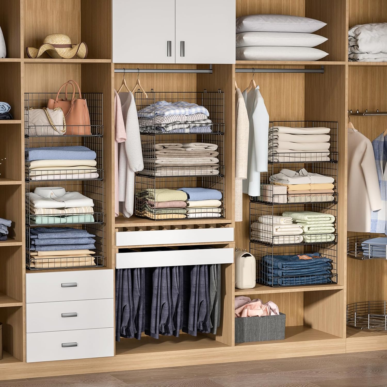 4-Tier Stackable Closet Organizers and Storage Shelves, Clothes Shelf Organizer Basket Bins, Foldable Sweater Storage for Closet Organizer System, Black (Patent Pending)