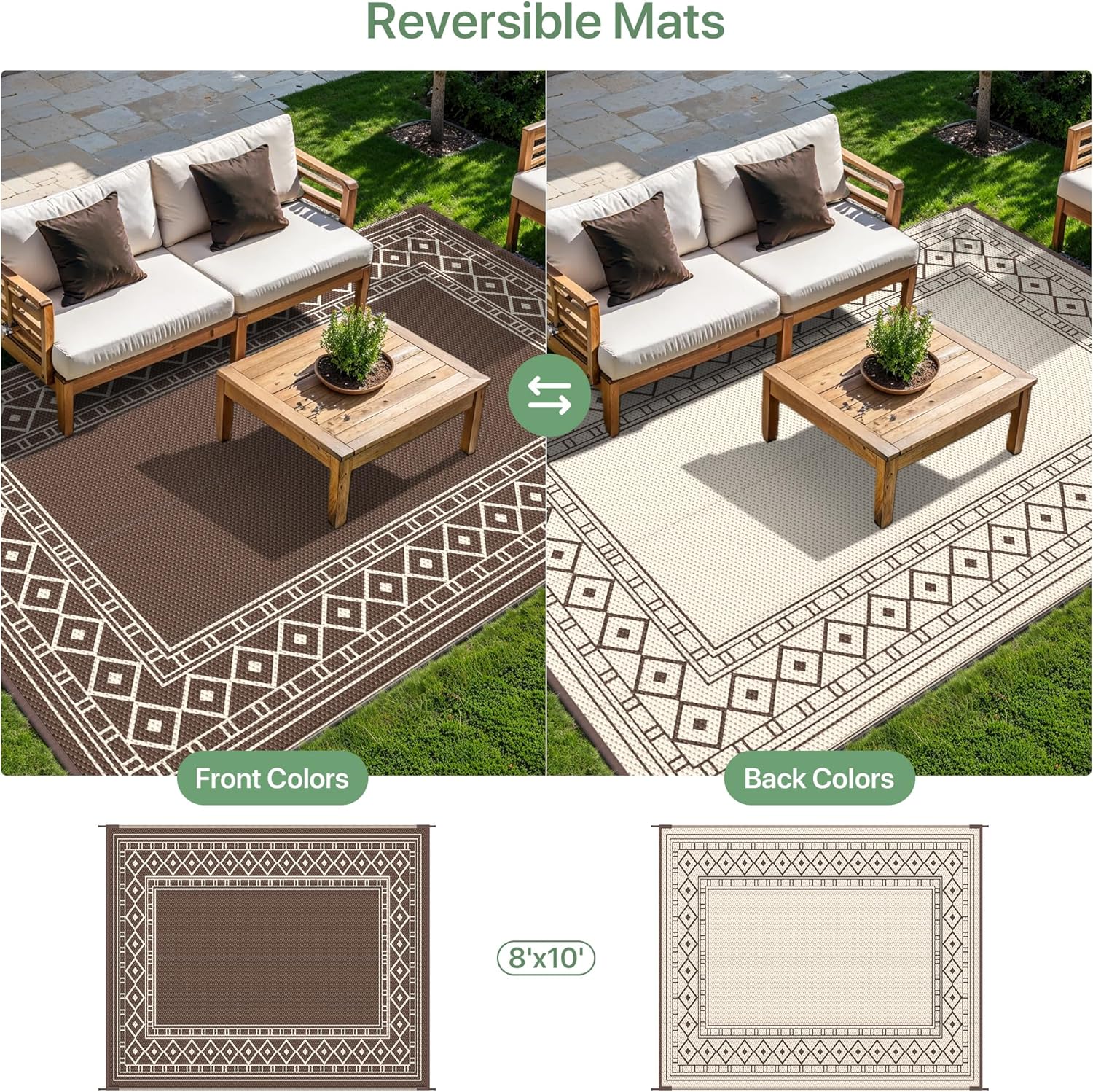 GENIMO Outdoor Rug Waterproof for Patio, 8'x10' Foldable Reversible Plastic Straw Carpet for Travel Trailers, Outside Area Mat for Rv, Deck, Picnic, Porch, Camper, Balcony, Beach, Coffee & Beige