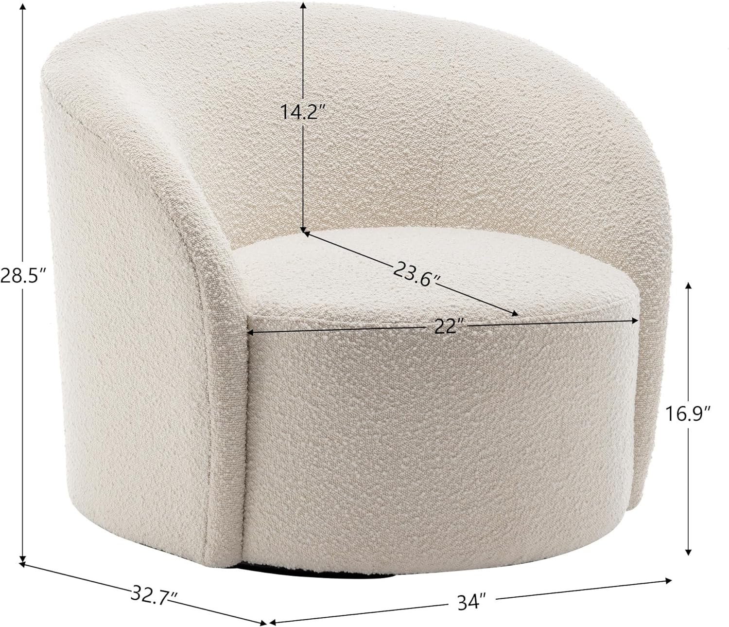- 34-IN WIDENED BARREL CHAIR - It's different than the tiny 25.6-inch barrel chair size on the market. KINWELL boucle swivel barrel chair overall size: 32.7'' D X 34'' W X 28.5'' H. Weight: 49.3 lbs. With a seat size of 16.9'' H X 22'' W X 23.6'' D. The space is comfortable enough for an adult to read or rest.