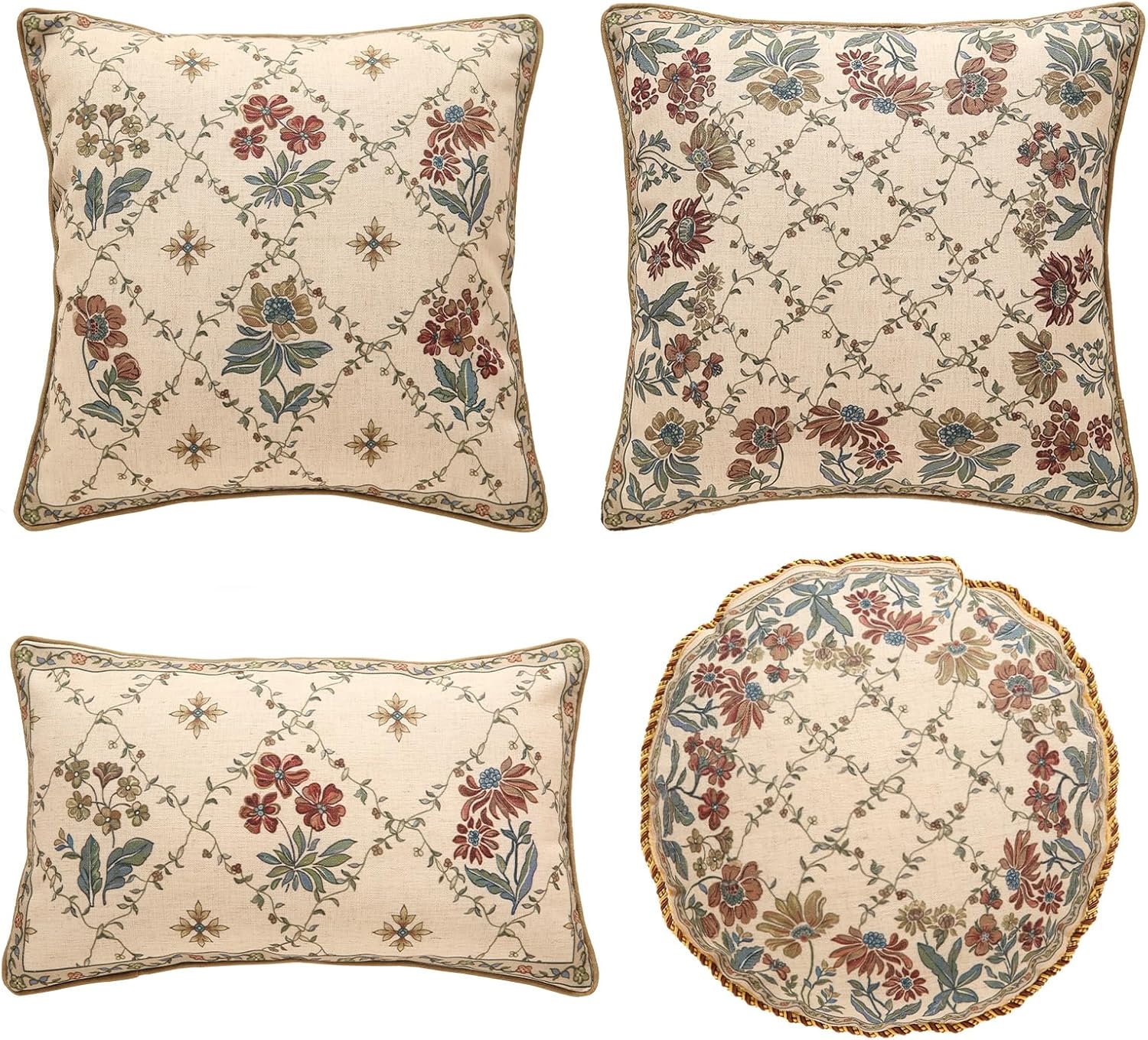 patdrea Designer Throw Pillow Covers Set of 4,Euro Vintage Light Brown Linen with Floral Collection Pattern Pillow Cover,Decorative Square Lumbar Round Pillowcases Cushion for Bed Living Room Car