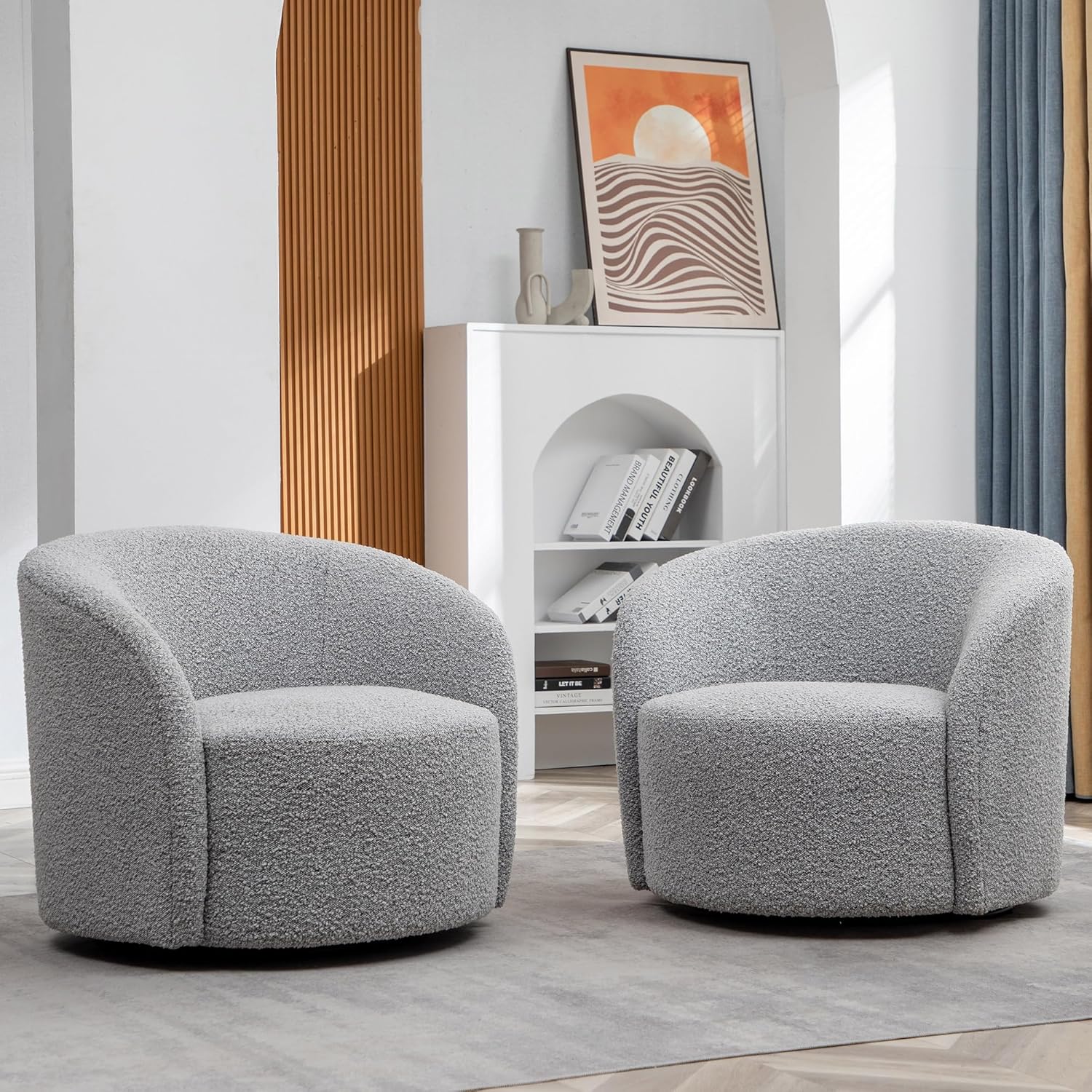 - HIGH-QUALITY BOUCLE UPHOLSTERY – This large Mid-Century Modern Swivel Barrel Chair is crafted with luxurious, popular boucle upholstery, providing a cozy, soft seating experience that instantly elevates your relaxation and comfort. Especially on cold days or when you are alone, bringing you the warmth of spring.