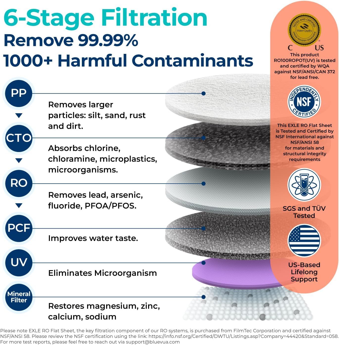 - 6-STAGE ADVANCED FILTRATION WITH UV LIGHT: The Bluevua RO100ROPOT-UV boasts a superior 6-stage filtration system, featuring a 0.0001μm RO membrane, including UV light and an added remineralization filter. Certified by WQA against NSF/ANSI/CAN 372 for lead-free and tested by SGS, this combination effectively reduces TDS, PFOA, PFOS, Chlorine, Fluoride, Arsenic, Lead, and more, while also enriching water with essential minerals, balancing taste and health benefits.
