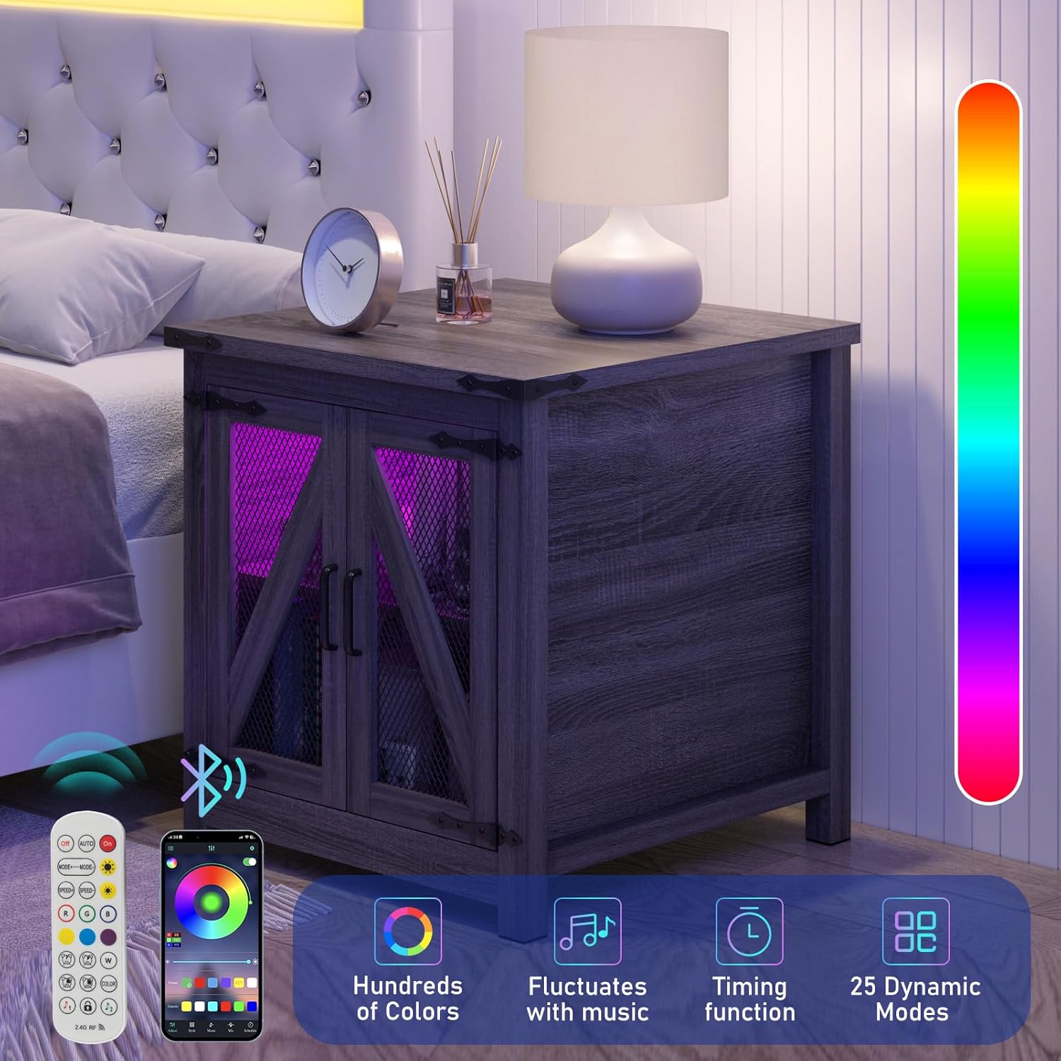 Farmhouse End Table, 24" Large Sofa Side Table with Charging Station, Mesh Barn Door, and Adjustable Storage Shelf, Rustic Wood Square Nightstand for Living Room, Bedroom, Office, Grey