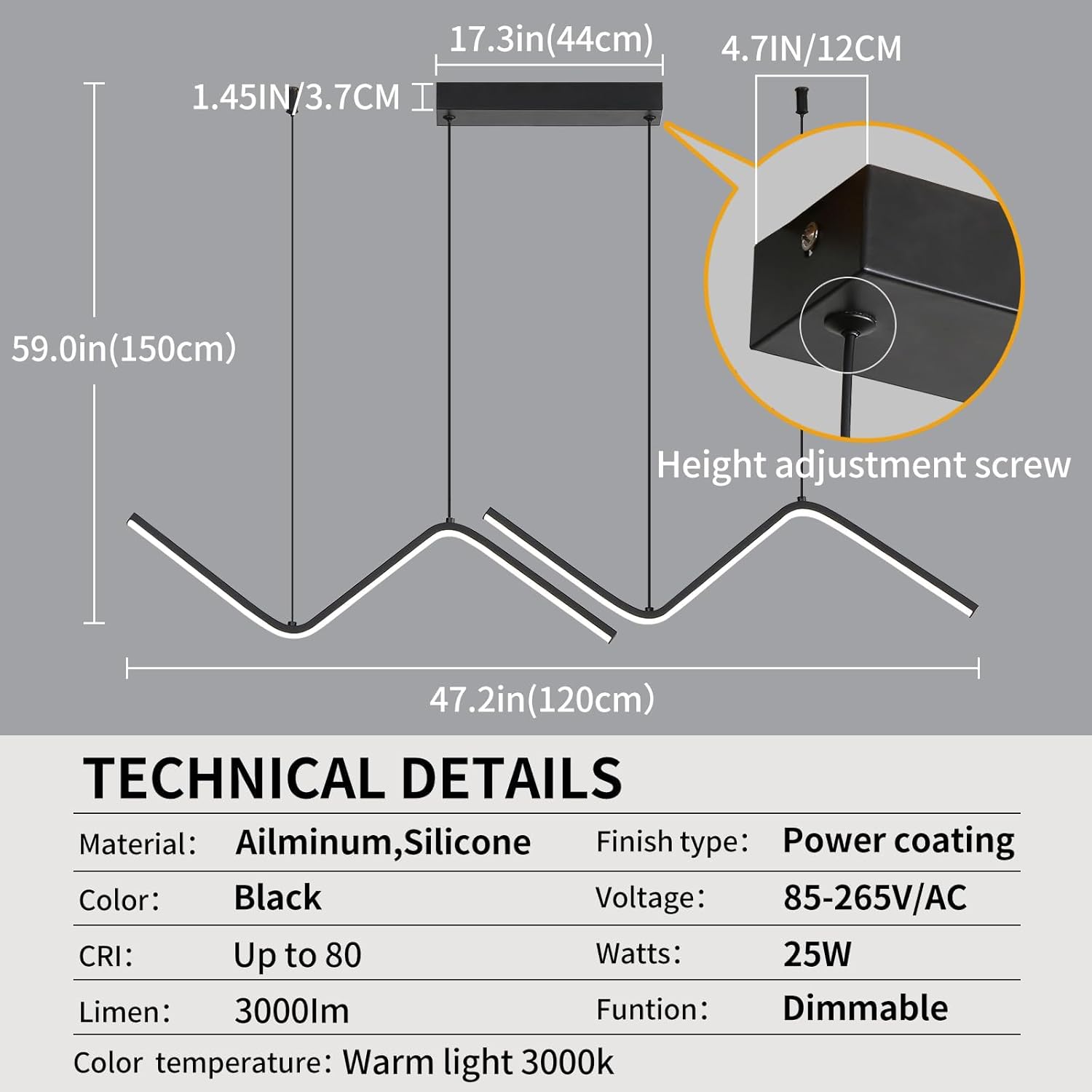 - Specification Parameters :Material:aluminum and acrylic, Power: 25W, Voltage: 85-265V/AC, Length: 120cm, Height:150cm, Base length:50CM. Suspension wire can be adjusted to the right height.