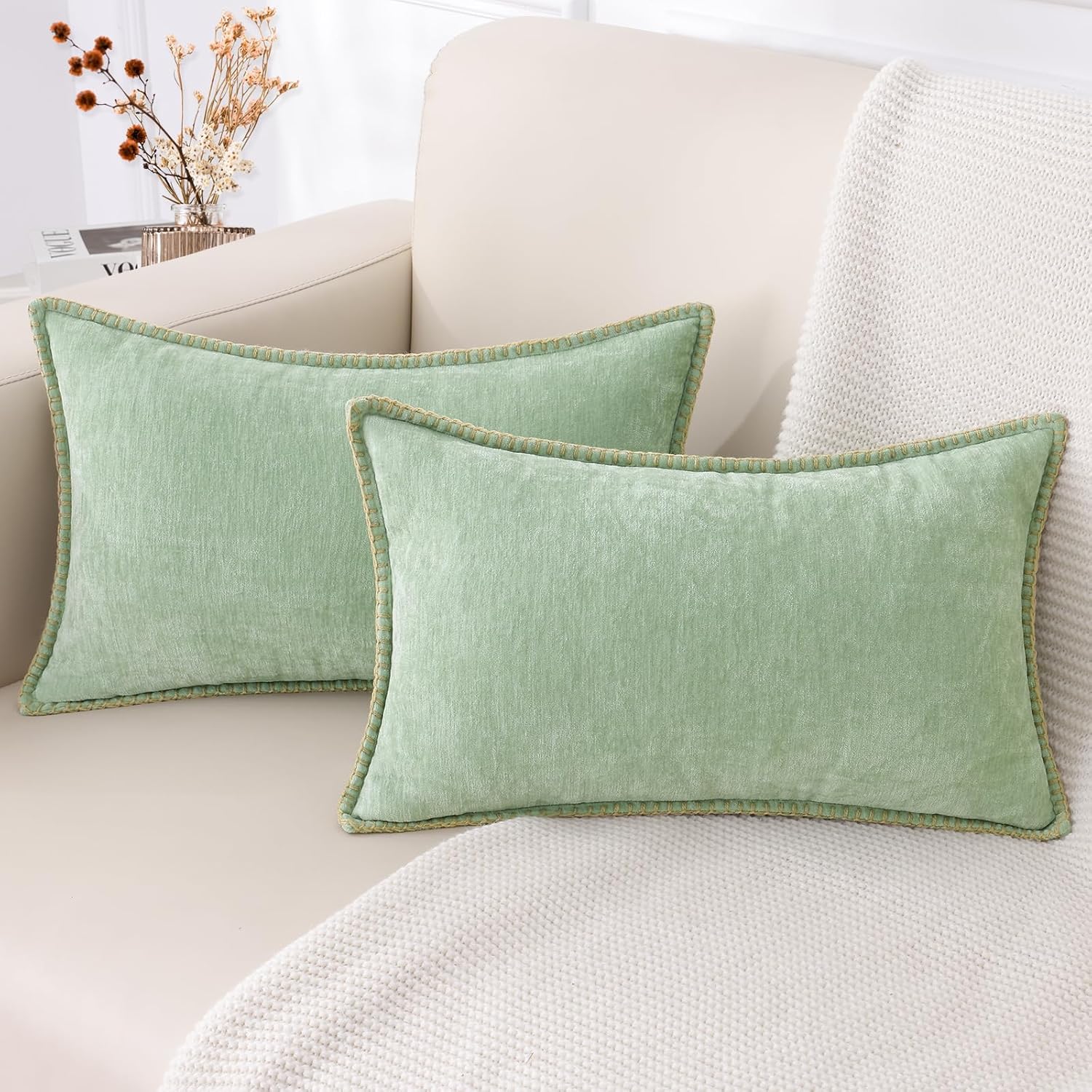 decorUhome Chenille Soft Throw Pillow Covers 12x20 Set of 2, Lumbar Velvet Farmhouse Neutral Decorative Euro Pillow Covers with Stitched Edge for Couch Sofa Bed Home Decor, Sage Green