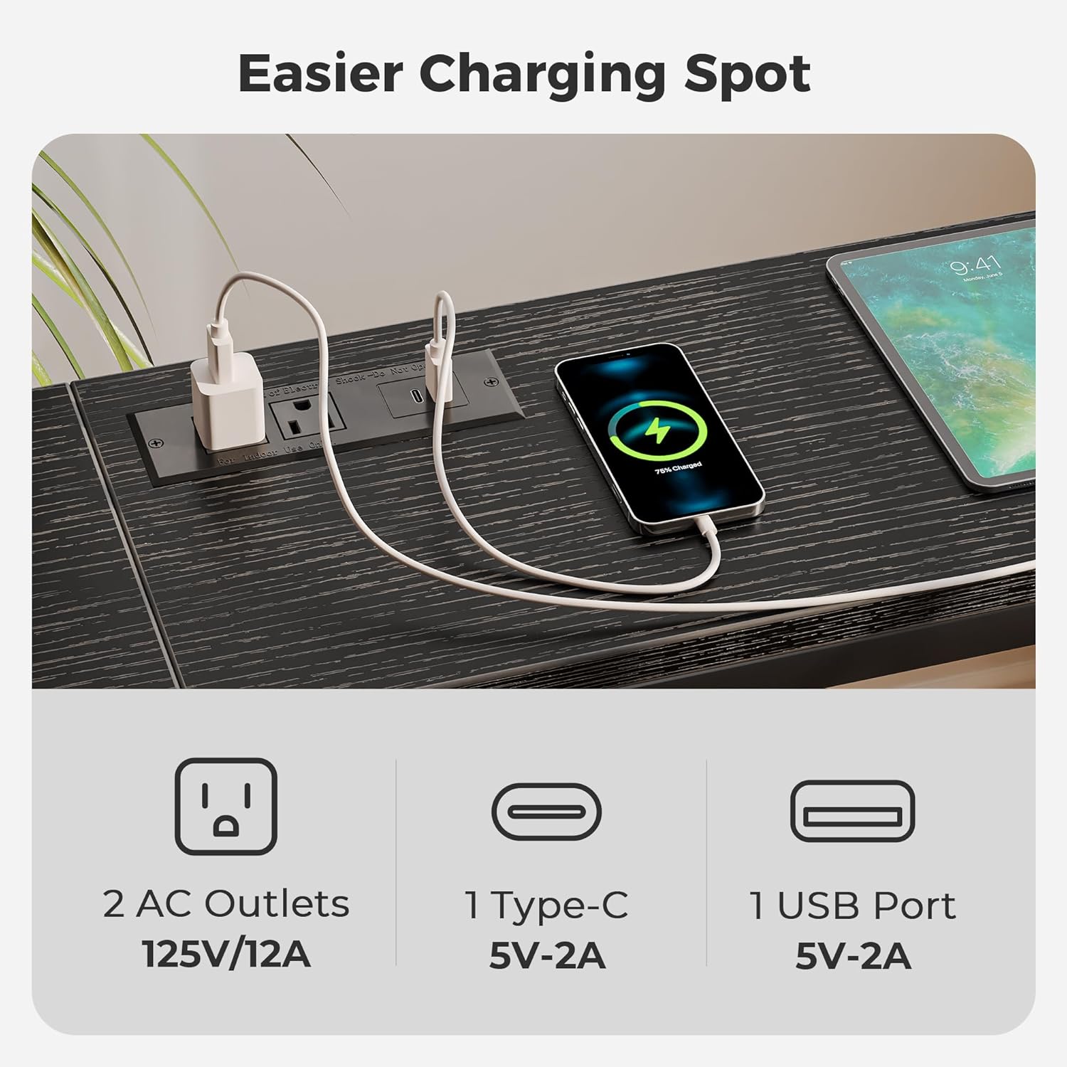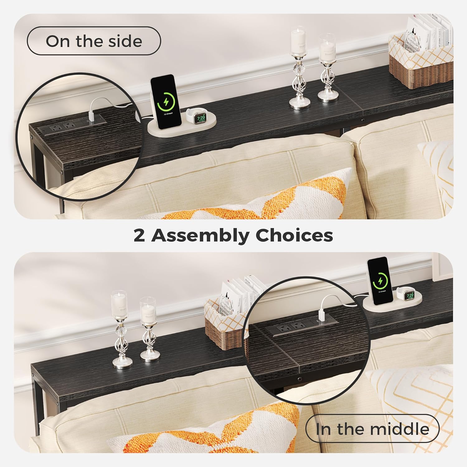 - [No Low Battery Warnings]: Imagine lounging on your sofa and brushing your phones to relax after a busy week. Donβt let low battery disappoint you. Let this sofa table narrow long with 2 AC outlets, 1 USB port and 1 Type-C port provide close-at-hand power