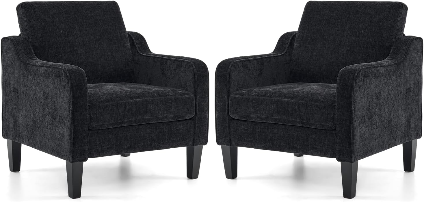 VINGLI Living Room Chairs Set of 2, Black Accent Chair 5.5" Thick Seat Cushion Comfy Chair Soft Chenille Side Chair Upholstered Arm Chair for Bedroom, Play Room, Apartment, Office (Black)