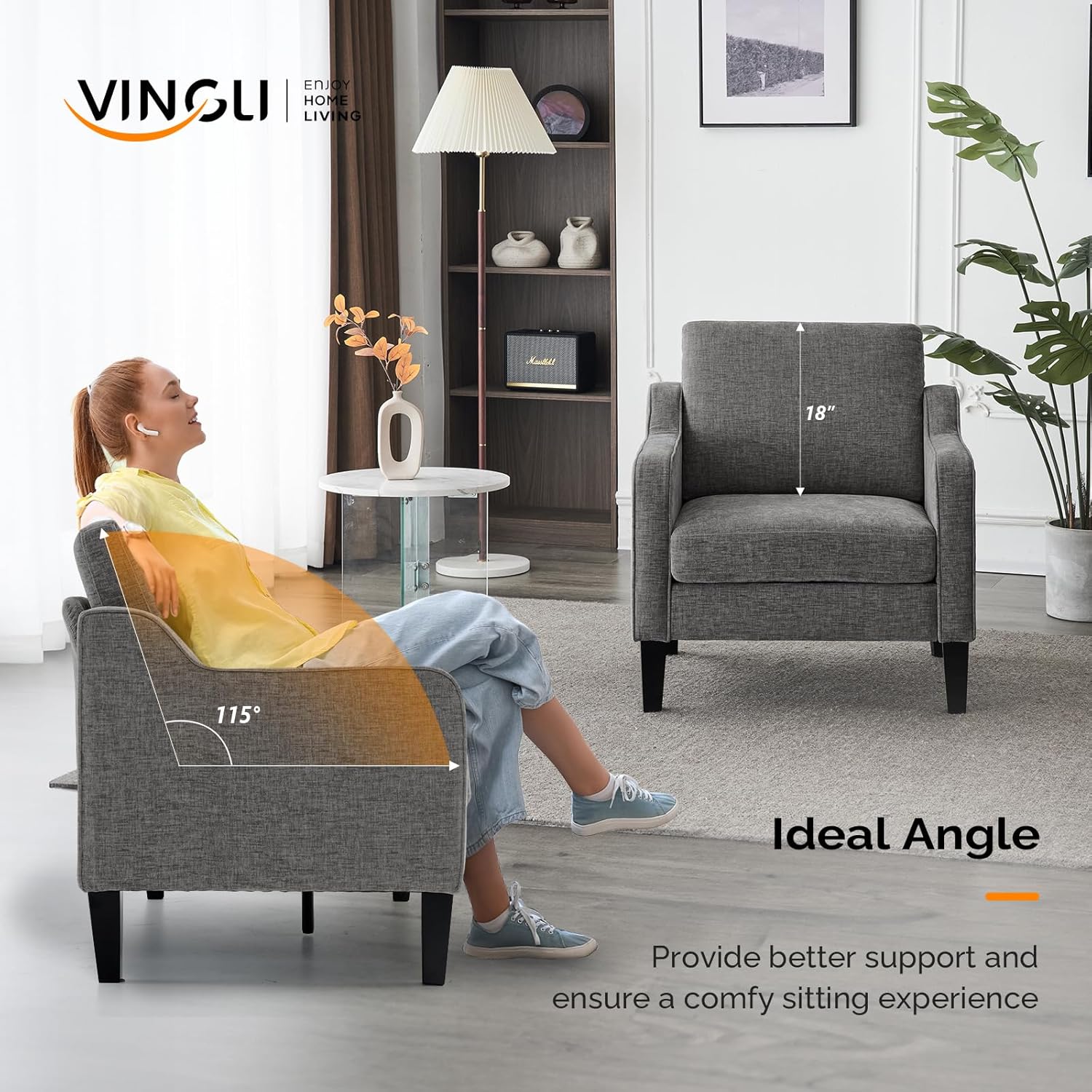 - Comfy and Supportive—The armchair with 115° seating angle offers enhanced support, alleviating lower back strain and ensuring a comfortable seating experience. It provides the perfect setting for a leisurely life, effortlessly meeting your relaxation needs.