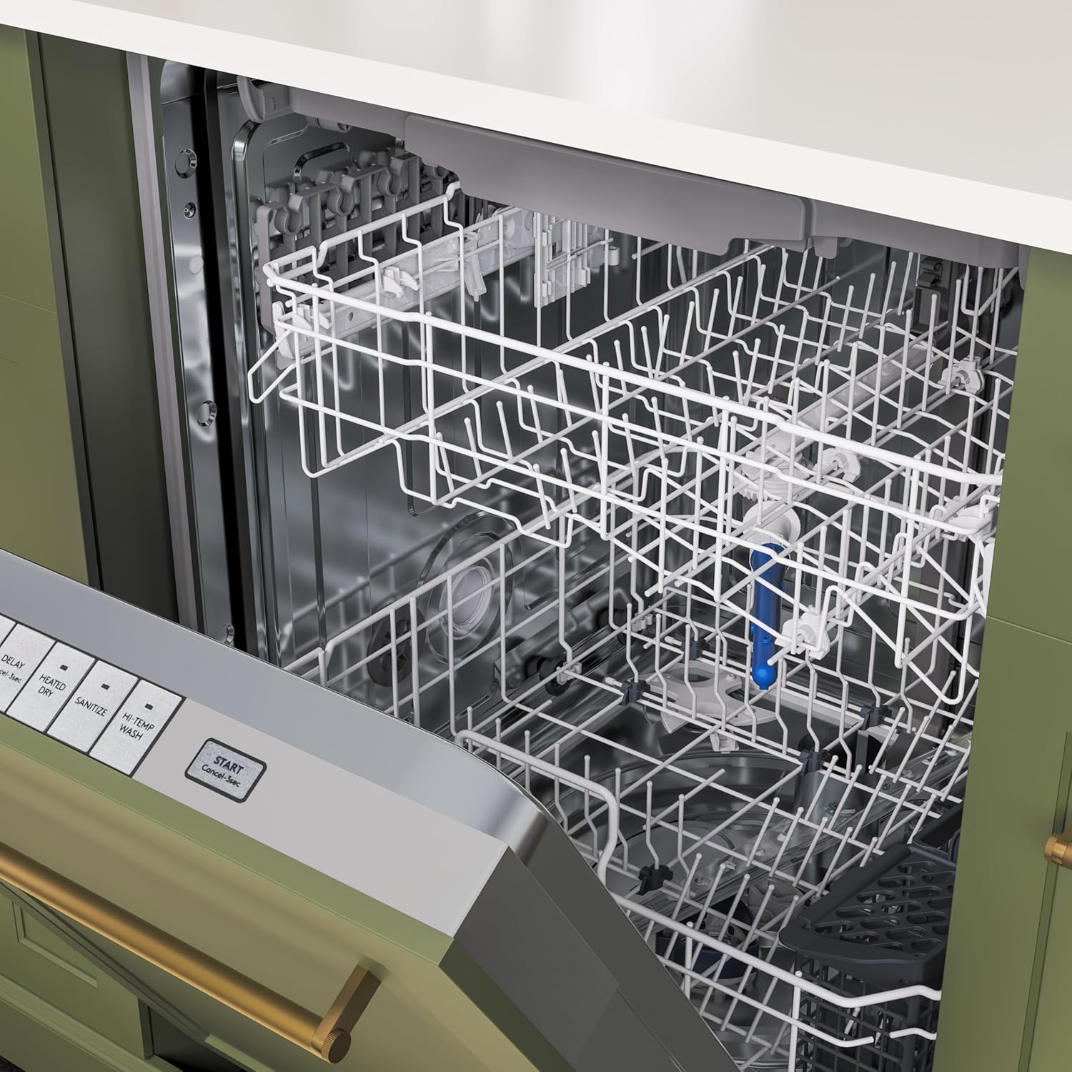 - Slide-Out Accessible Racks – Each kitchen dishwasher is fitted with two ergonomic racks for holding cups, plates, pots, pans, and dishware more effectively. The racks even feature pop up and down holders to let you customize your load capacity.