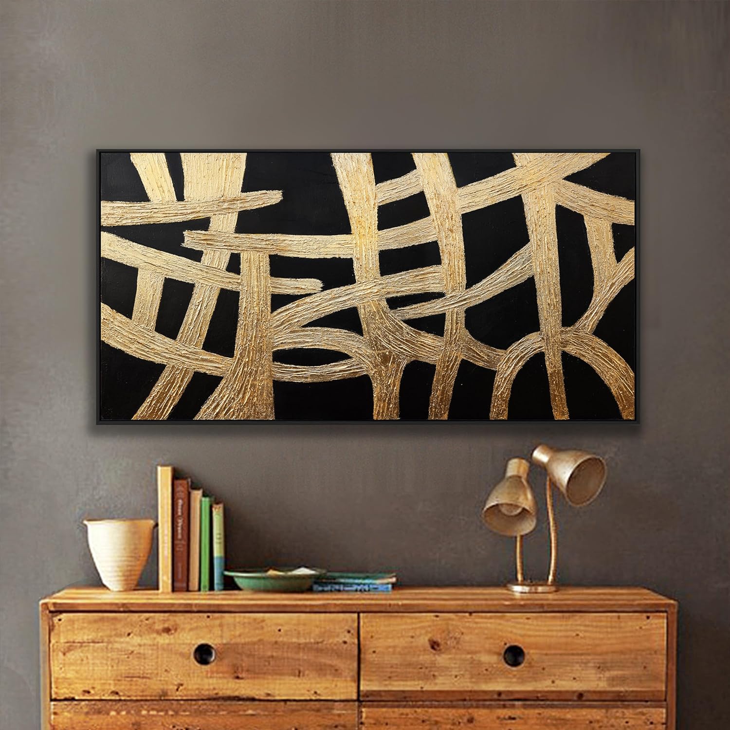 Abstract Wall Art Small Size Black And Gold Lines Texture Artwork Framed Home Decoration Artwork Decor Modern Minimalist Canvas Painting Living Room Decor For Bedroom Office Wall Decor 20"X40"