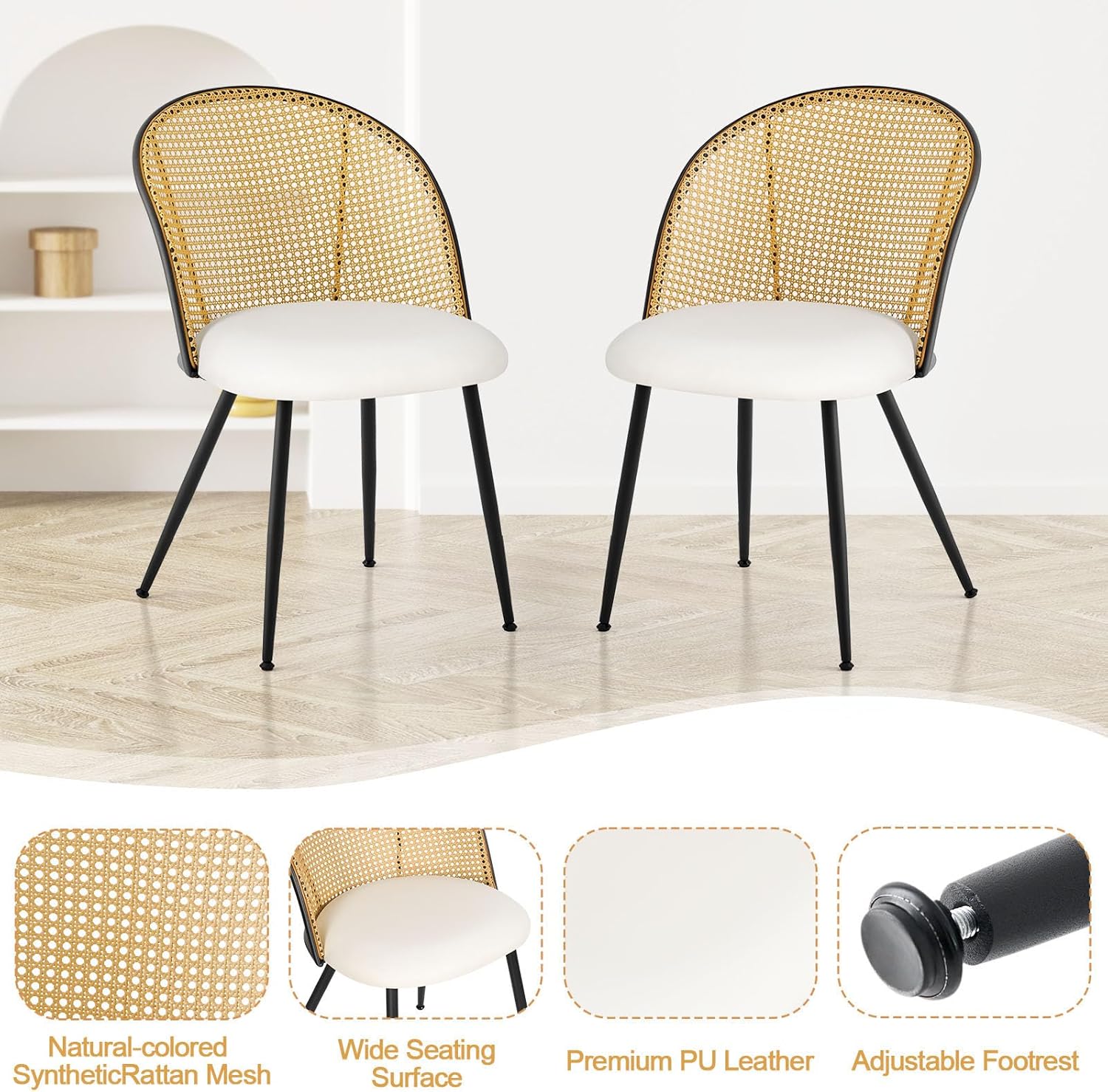 Dining Chairs Set of 4, Mid Century Modern Dining Room Chairs with Full Rattan Back, Faux Leather Kitchen Dining Chairs Farmhouse Armless Mesh Cane Back Side Chairs with Metal Legs, White