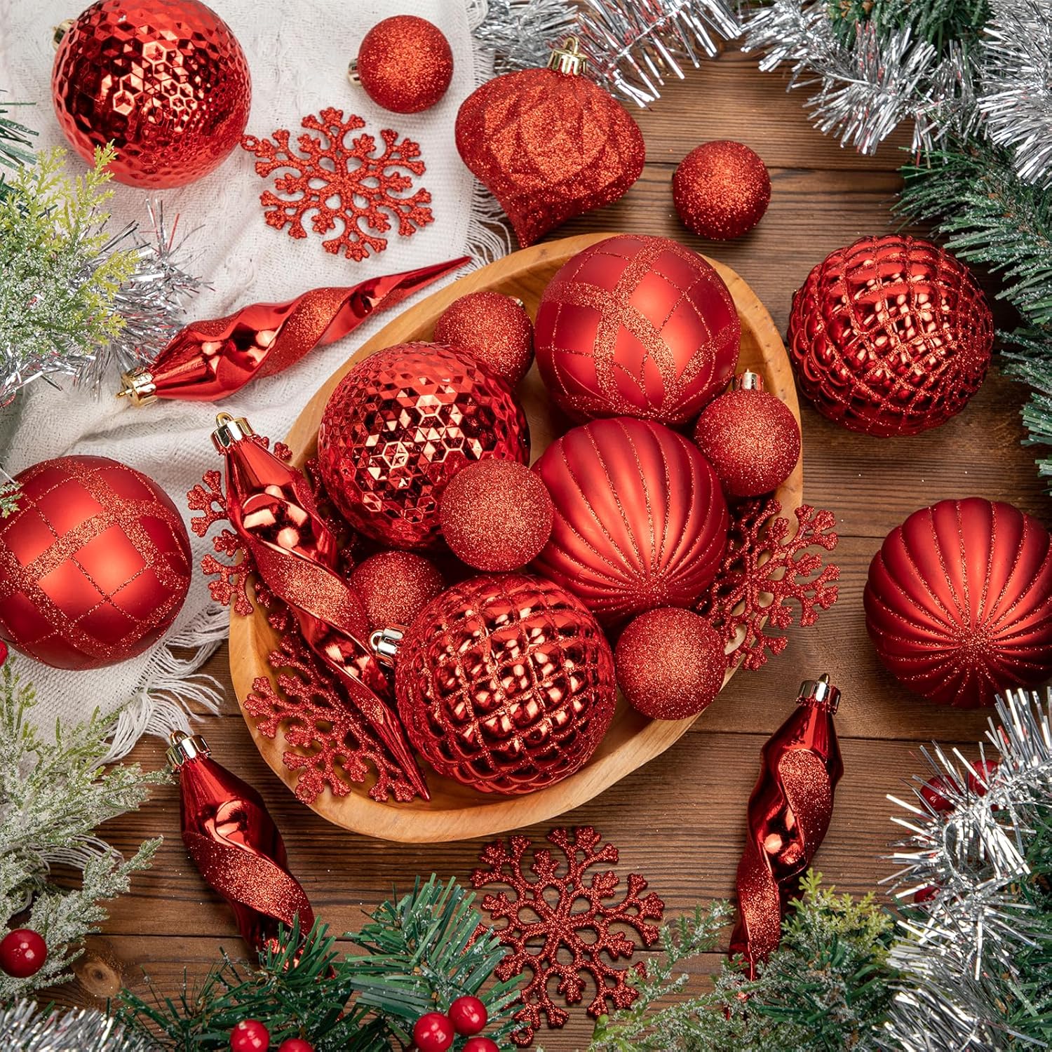 - VARIETY OF SHAPES AND SIZES FOR A PERFECT HOLIDAY LOOK – The set features a mix of 3.1-inch (8 cm) Christmas balls, 5.9-inch (15 cm) icicle ornaments, 1.6-inch (4 cm) glitter balls, and snowflake ornaments. This variety provides dimension and visual interest to your Christmas tree, garlands, wreaths, or holiday displays, ensuring a cohesive and polished appearance for your home