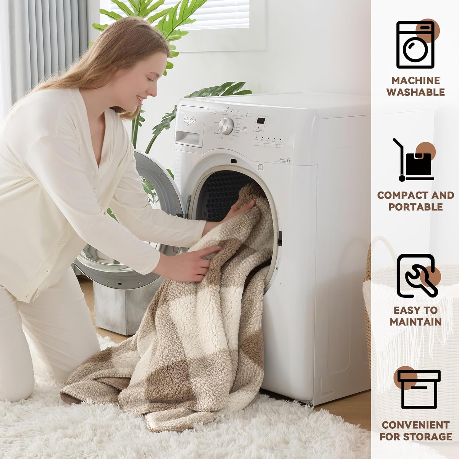 LURKA Checkered Sherpa Fleece Queen-Size Bed Blanket - Extra Thick and Warm Winter Soft Fuzzy Plush Blanket for Couches, Beds & Pets, Khaki, 90x90 Inches