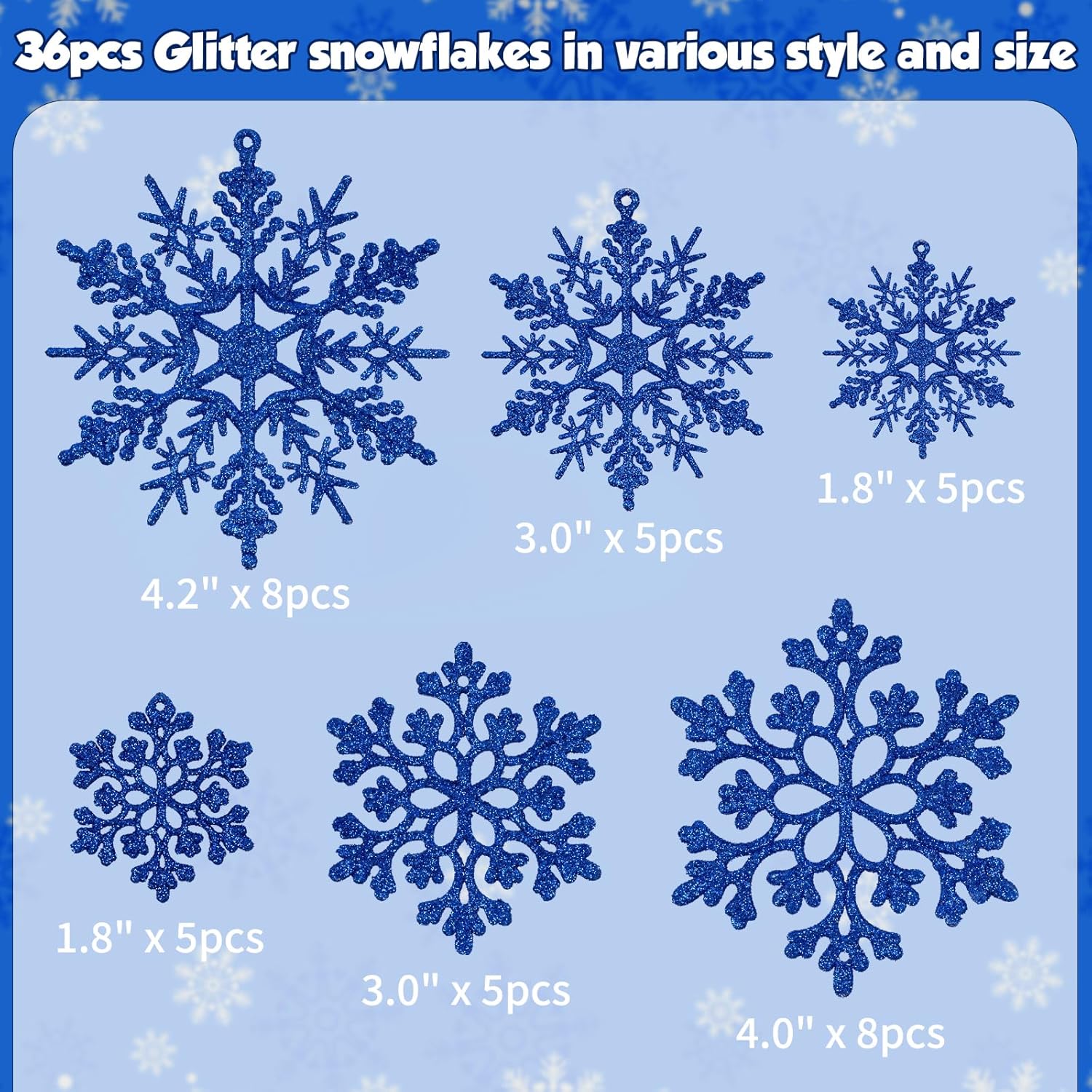 - SNOWFLAKES OF VARIED SIZES: A value pack of 36pcs navy blue Christmas glitter snowflakes in 4 varied sizes and 2 different patterns: 8pcs for 4.2 inch, 8pcs for 4 inch, 10pcs for 3 inch for both styles and 10pcs for 1.8 inch for both styles. It’s a lot of snowflakes sufficient for your Christmas decorations.