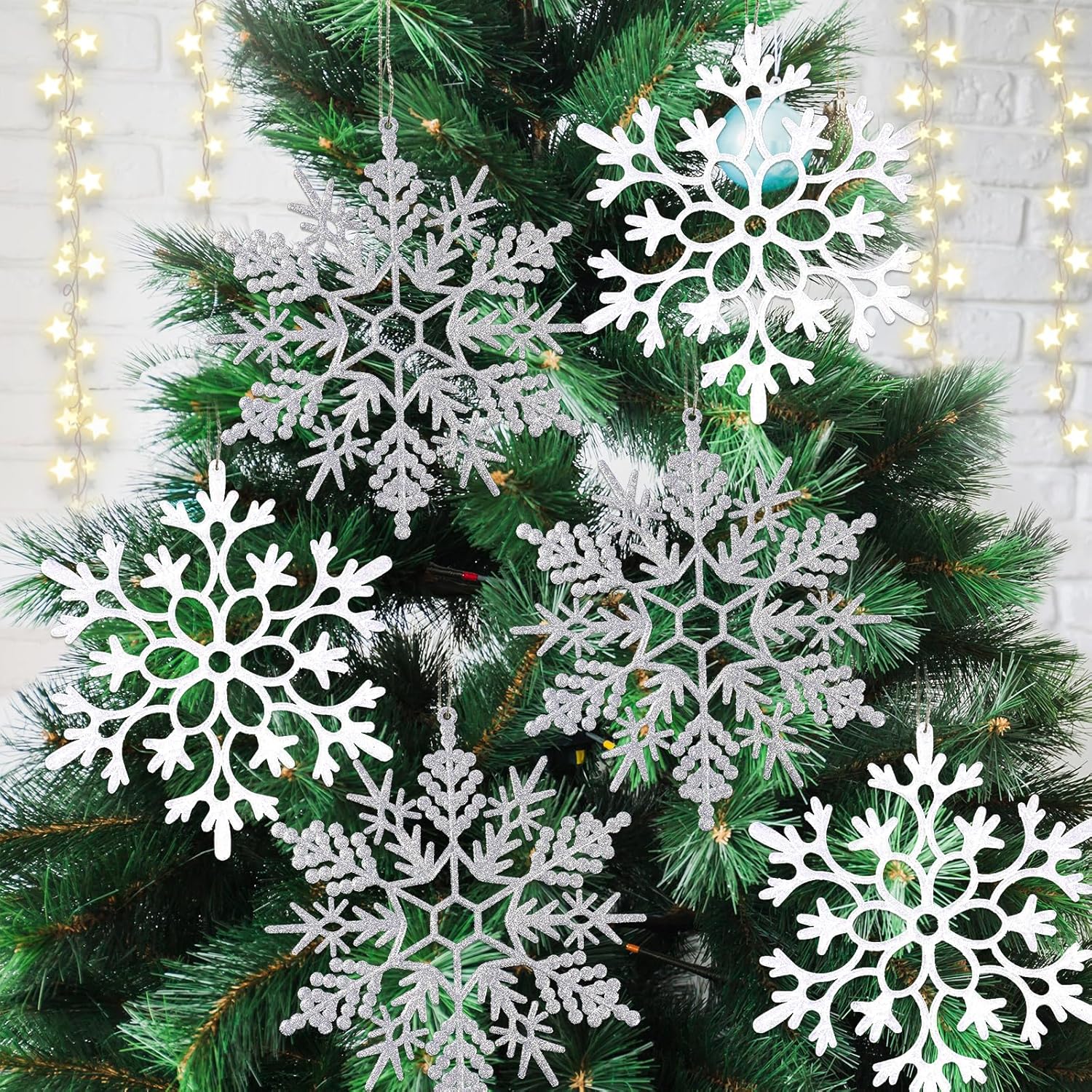 - STURDY BIG SNOWFLAKES: These white silver snowflakes are well made of quality plastic with sparkly glitter scattered on them, stunning and reusable, able to stand up to bad weather outside and keep their shape well. Glitter attached closely and not easy to fall off, absolutely great Christmas decoration ornaments for years of use, save them