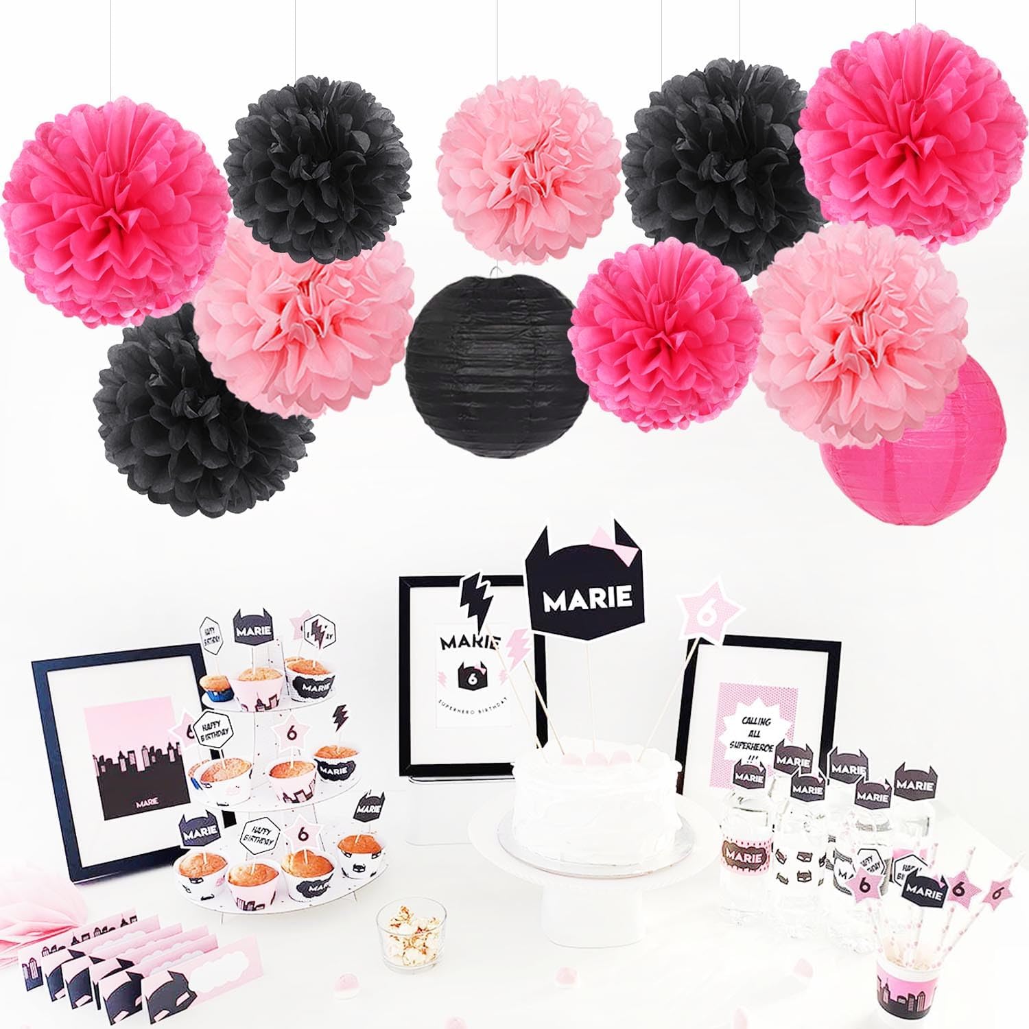 - 【Pink Black Party Decorations Kit Includes】The party decorations kits include 9pcs tissue paper flowers: 6pcs 10" and 3pcs 8" in Pink Black color, 6pcs 8inch paper lanterns.