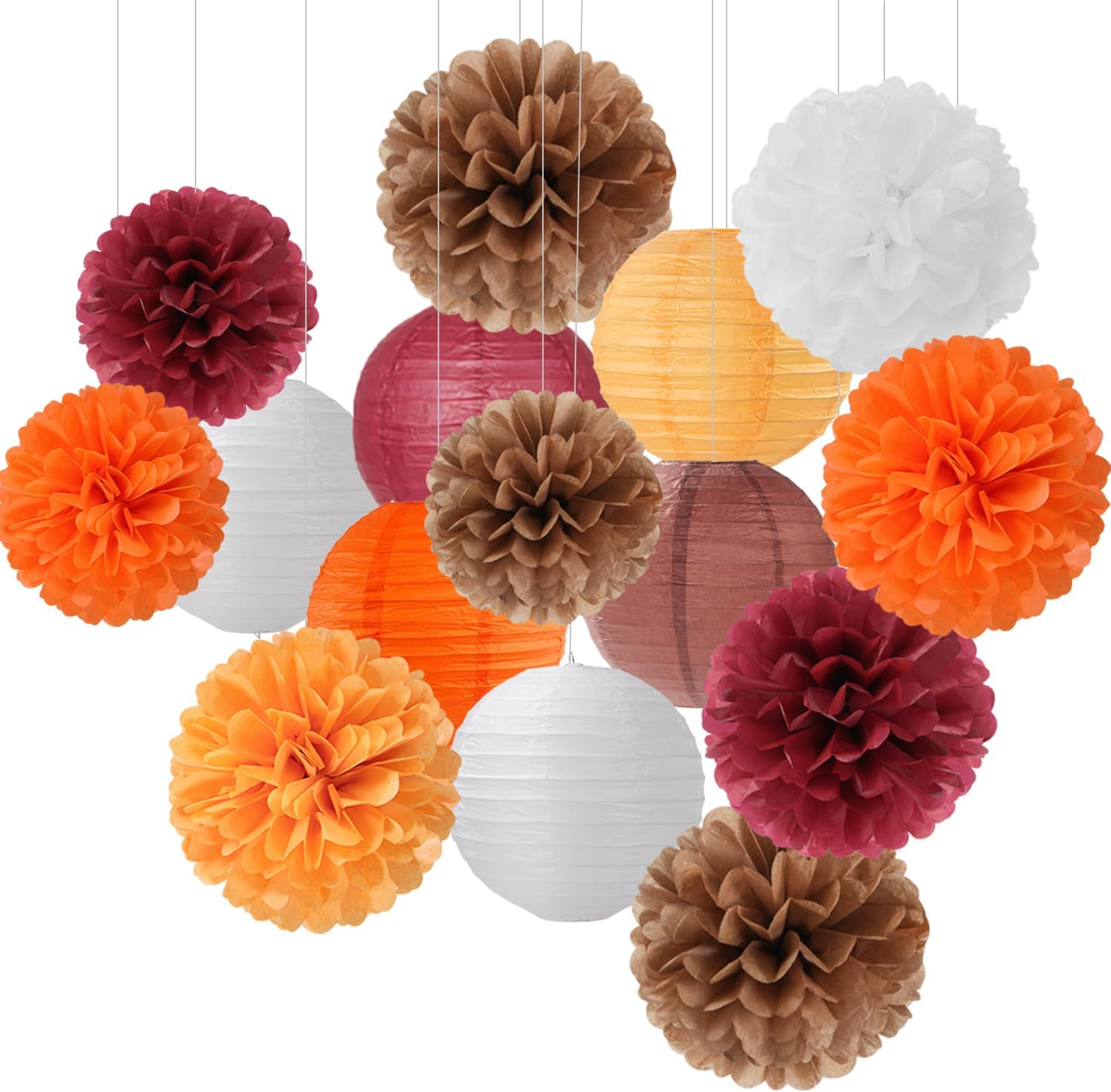 Brown Burgundy-Orange Party-Decorations Paper-Flowers Lanterns - 15PCS Fall Boho Tissue Pom Poms Streamers,Baby Bridal Shower Rustic Wedding Neutral Birthday Coffee Halloween ThanksgivingDecor Hugfond