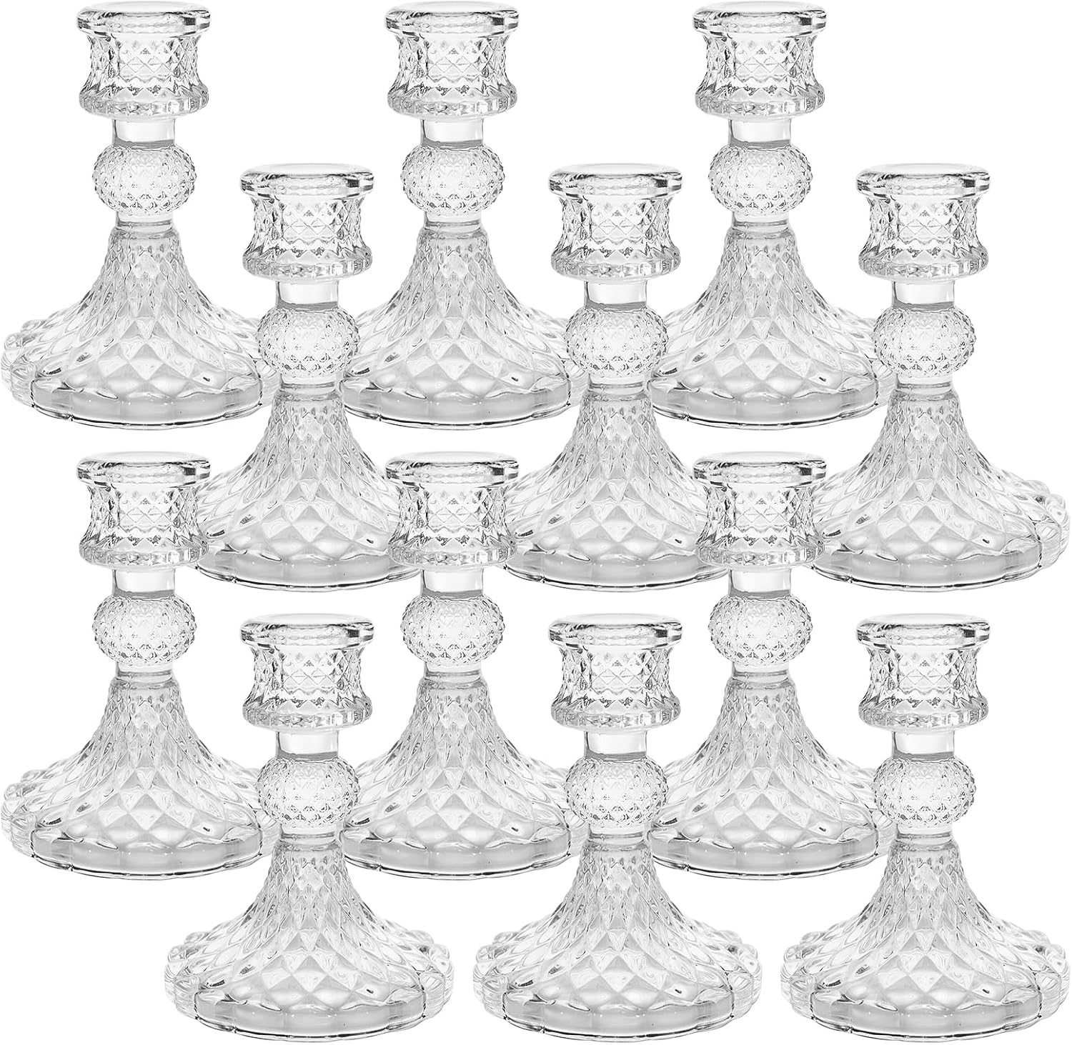 - Candlestick Holders Size:The measure of glass candlestick holders bottom diameter is 3 inch/7.6 cm, candle hole diameter is 0.79 inch/2 cm, and the height is 4 inch/ 10.1 cm;Set of 12 candle holders for pillar candles fit most standard taper candles