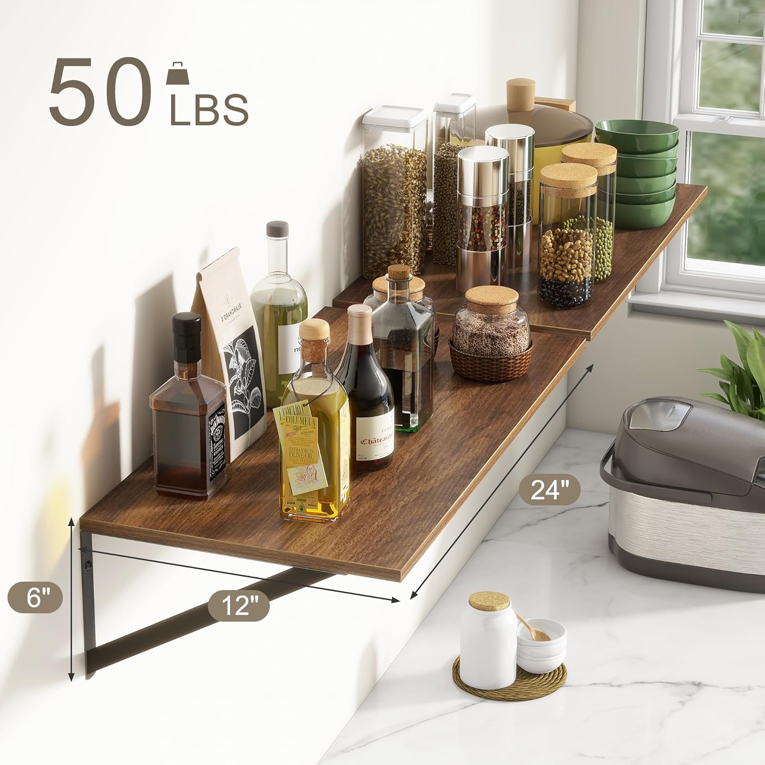 Deep Floating Shelves, 12 Inch Deep Floating Shelves for Wall, 24"W x 12"D Wall Shelves for Books, Large Rustic Wooden Shelf, Wide Display Shelf for Bathroom, Living Room, Walnut Color, Set of 2