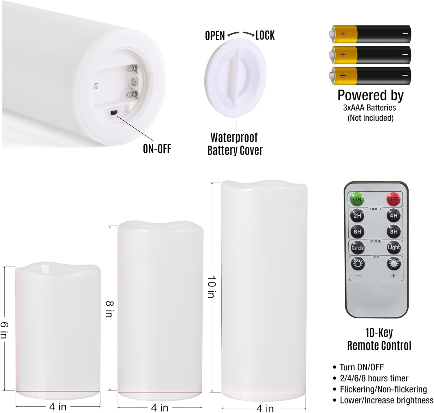 - Battery Operated: Product Size: 6"8"10" x 4". Each flameless candle requires 3 AAA batteries (Not included). Flickering flameless candles have no real fire, no smoke, no messy dripping wax. Safe for families with pets or little children. Great to set the mood of your room, porch and patio.