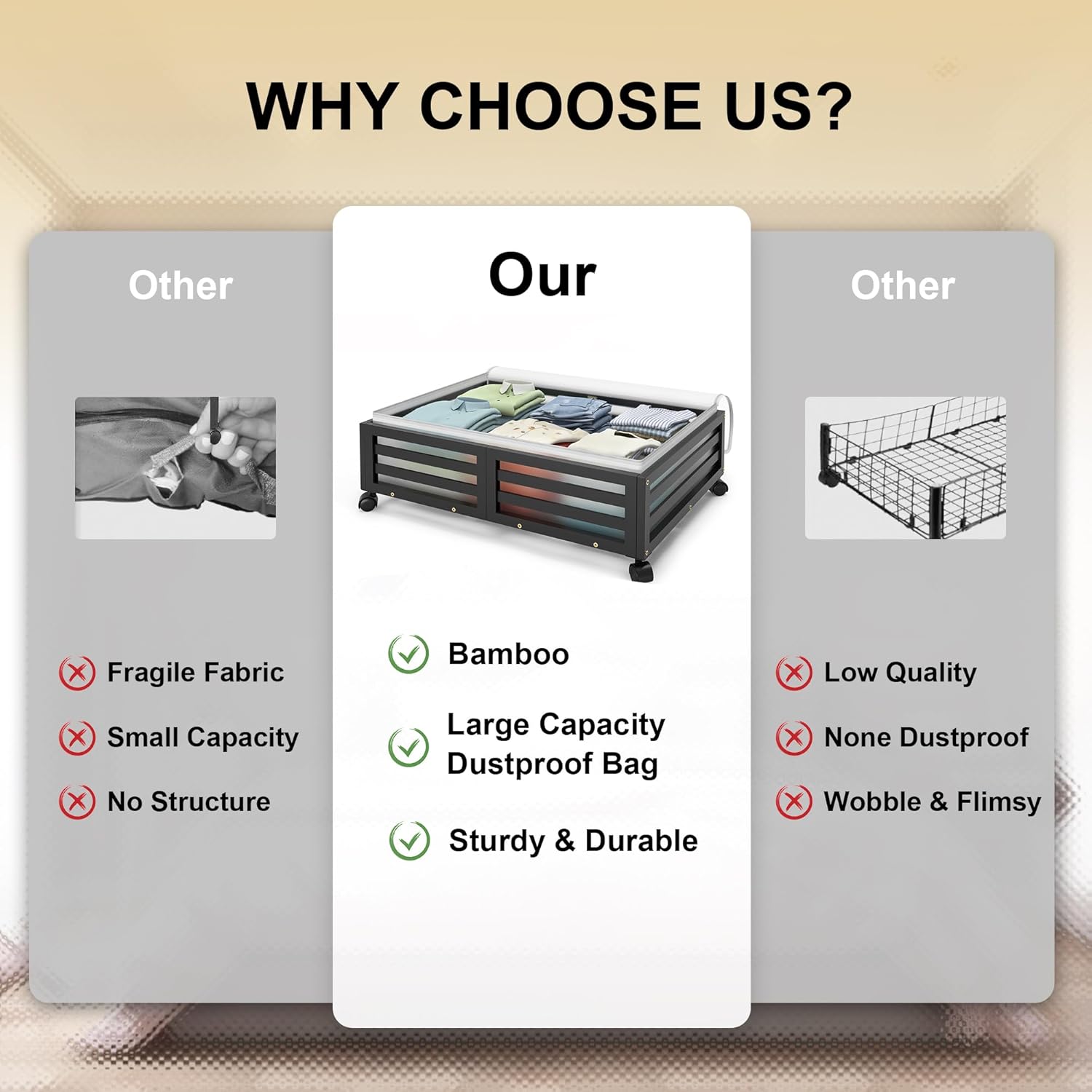 - ✅【Sturdy Under Bed Storage】:Our underbed storage units are built to last with high-quality 100% Real Bamboo,Beautiful appearance compared,oasting 4 rotating wheels with capacity of 120lbs, 48L large capacity dustproof cover bags hile the load-bearing capacity and durability are dramatically increased ,It's a versatile storage solution that can be customized based on your needs.