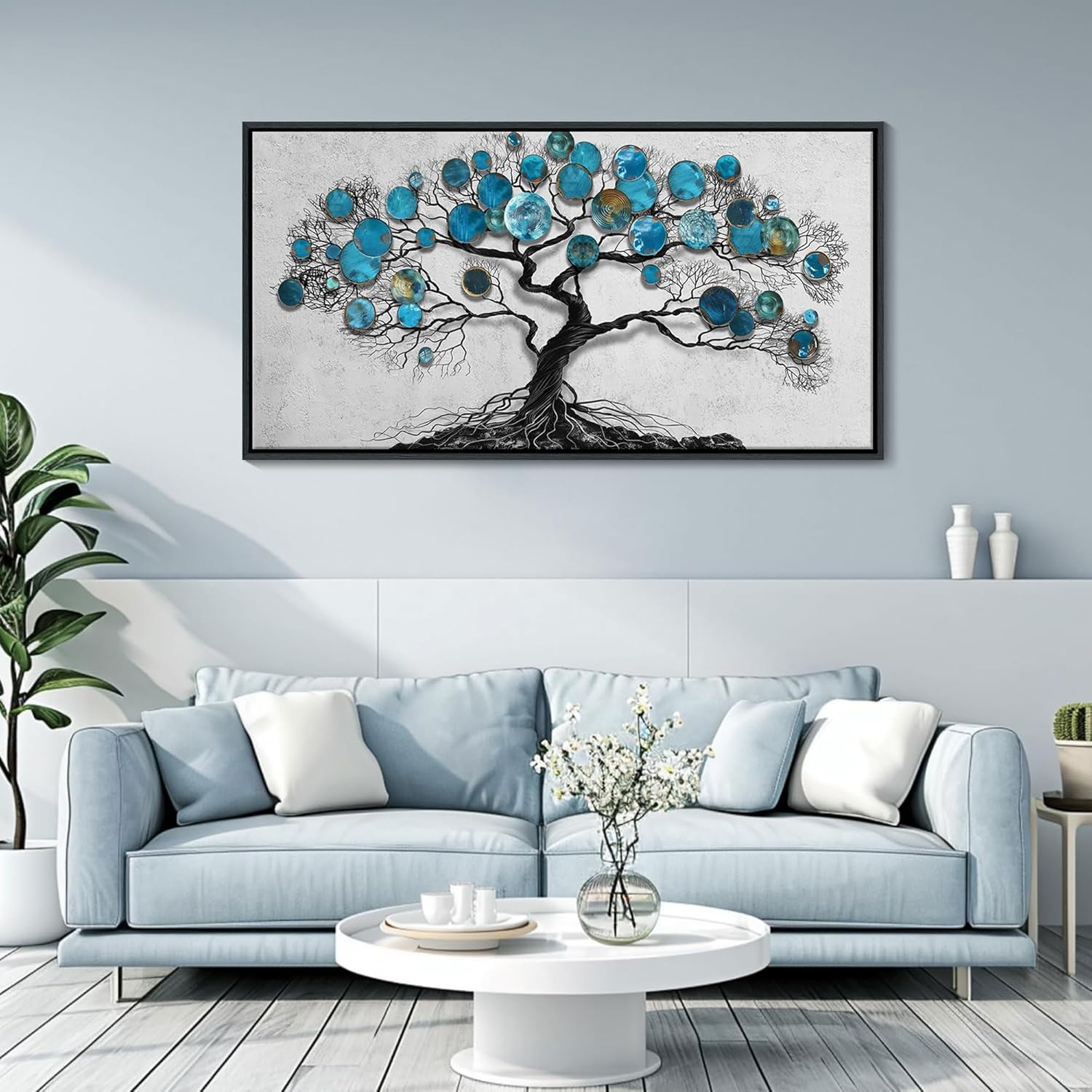 - Large Bedroom Teal Wall Art: This living room wall art features a tenacious tree of life design, gray background with black branches blue leaves concept to enhance the beauty of your home, become an excellent mural pictures.