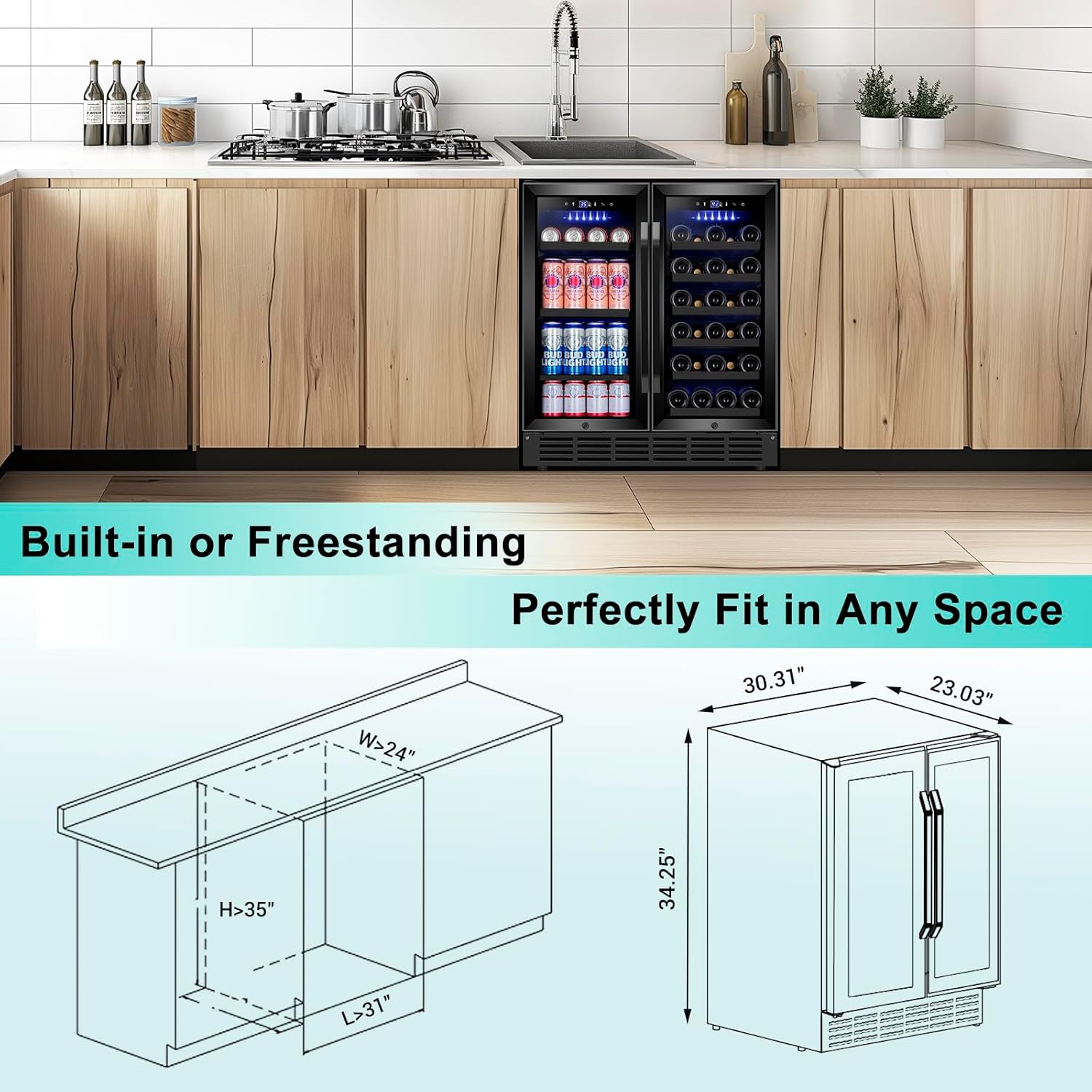 - Flexible Installation + Secure Design: Built-in or freestanding, this wine beverage cooler fits seamlessly under counters or in open spaces. The front-vent design and safety lock provide versatility and protection—ideal for homes, bars, offices, and more!
