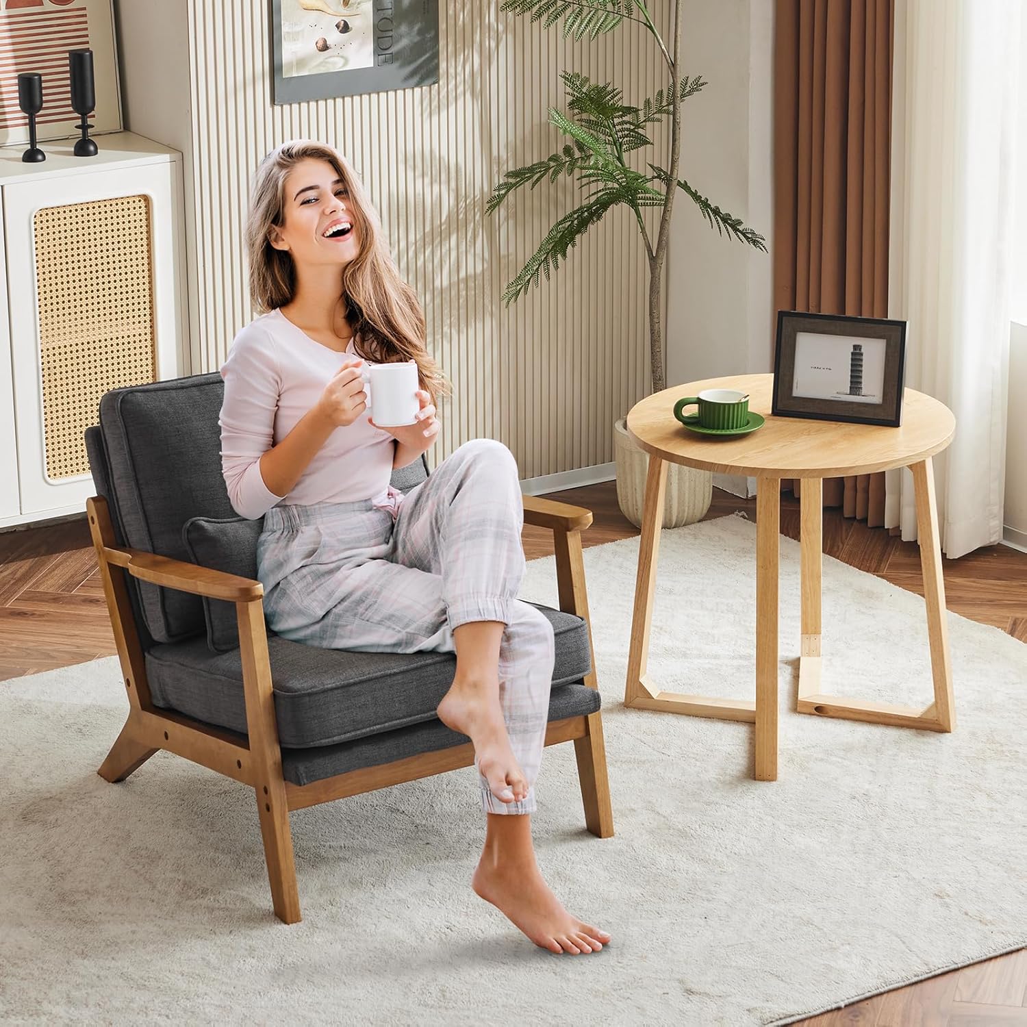 - Humanized Design - The ergonomic angles of the backrest and armrests are designed to give you good relaxation when you sit down and put on your arms. Comfortable linen fabric with a high-density sponge inside, sufficient back support, and a solid wood frame bring maximum comfort.