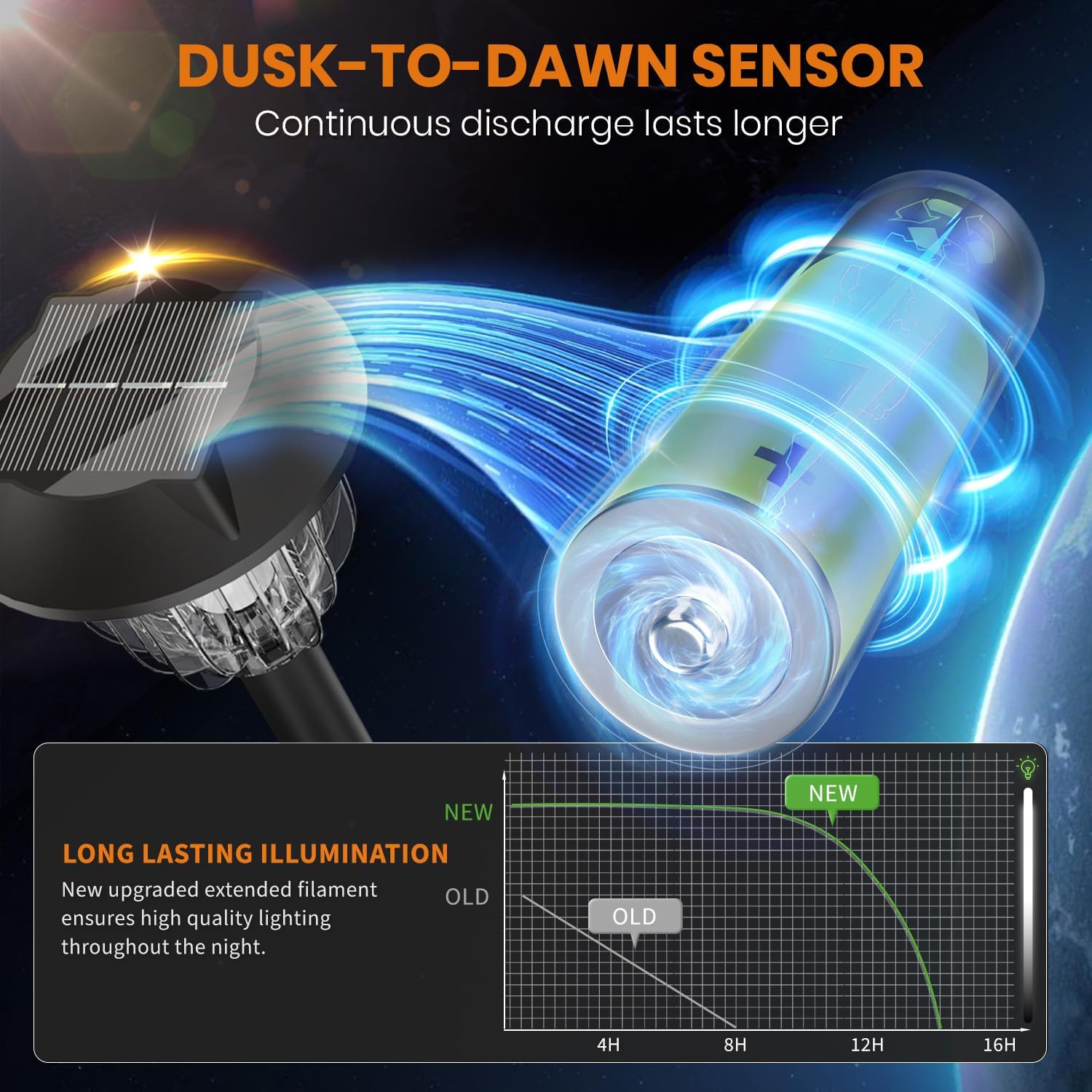 - FASTER CHARGING & Auto ON/OFF: The solar powered light has a solar panel that absorbs sun light during the day to convert sunlight into electricity to recharge the Ni-MH battery (included). Fully charging for 6-8 hours can continuously glow for 12-24 hours, which can automatically turn on at night and turn off at dawn.