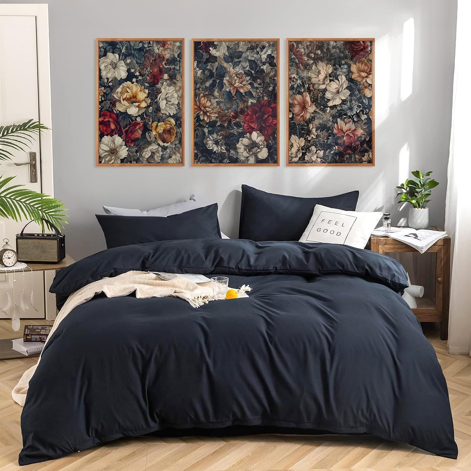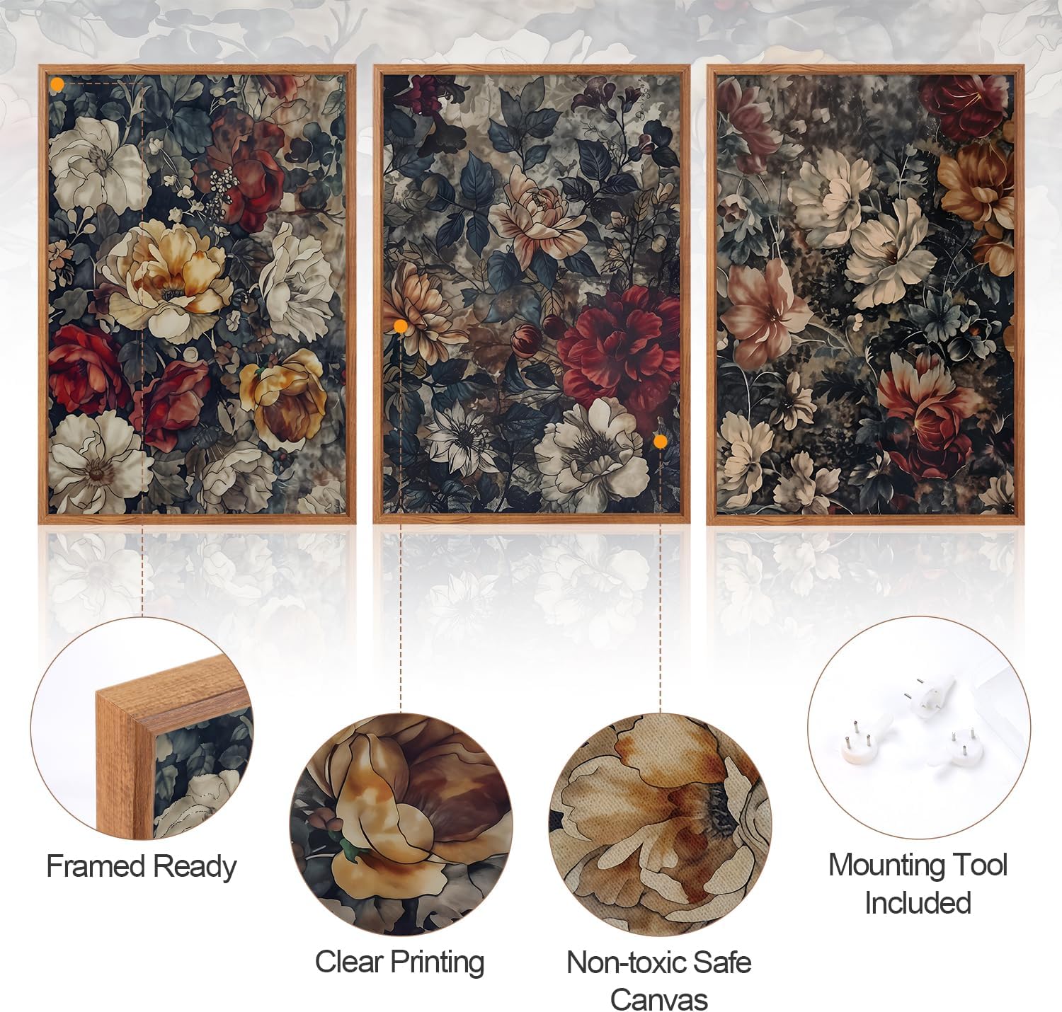 Aurlan Dark Moody Boho Wildflowers Wall Art Set(16"x24"), 3 Pieces Vintage Mid Century Modern Floral Framed Canvas Artwork, Large French Penoy Botanical Wall Decor for Office Bedroom Living Room