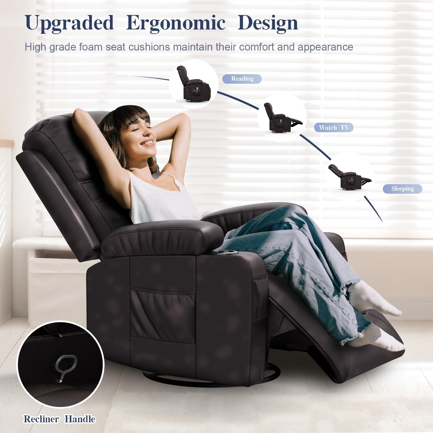 Recliner Chairs for Adults, FSC Certified Massage Rocker with Heated Modern Ergonomic Lounge 360 Degree Swivel Single Sofa Seat Living Room Lounge Recliners Brown
