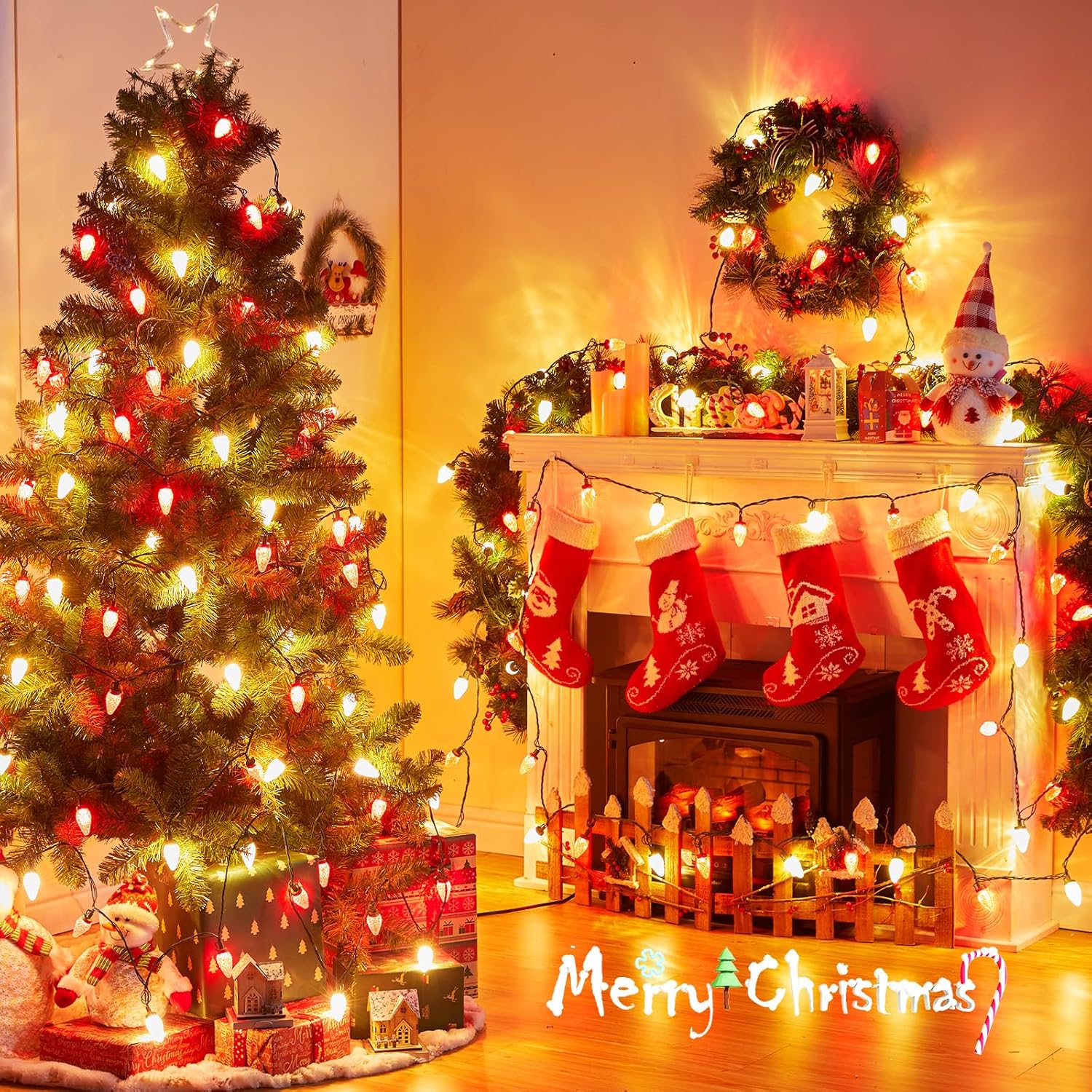 - 50 LED C9 Christmas Lights: The plug-in C9 Christmas lights are 33 feet long and feature 50 bright strawberry-shaped LEDs with 8-inch spacing between each bulb. Green cord is more suitable for Christmas tree decoration, adding a festive and warm atmosphere to your home.