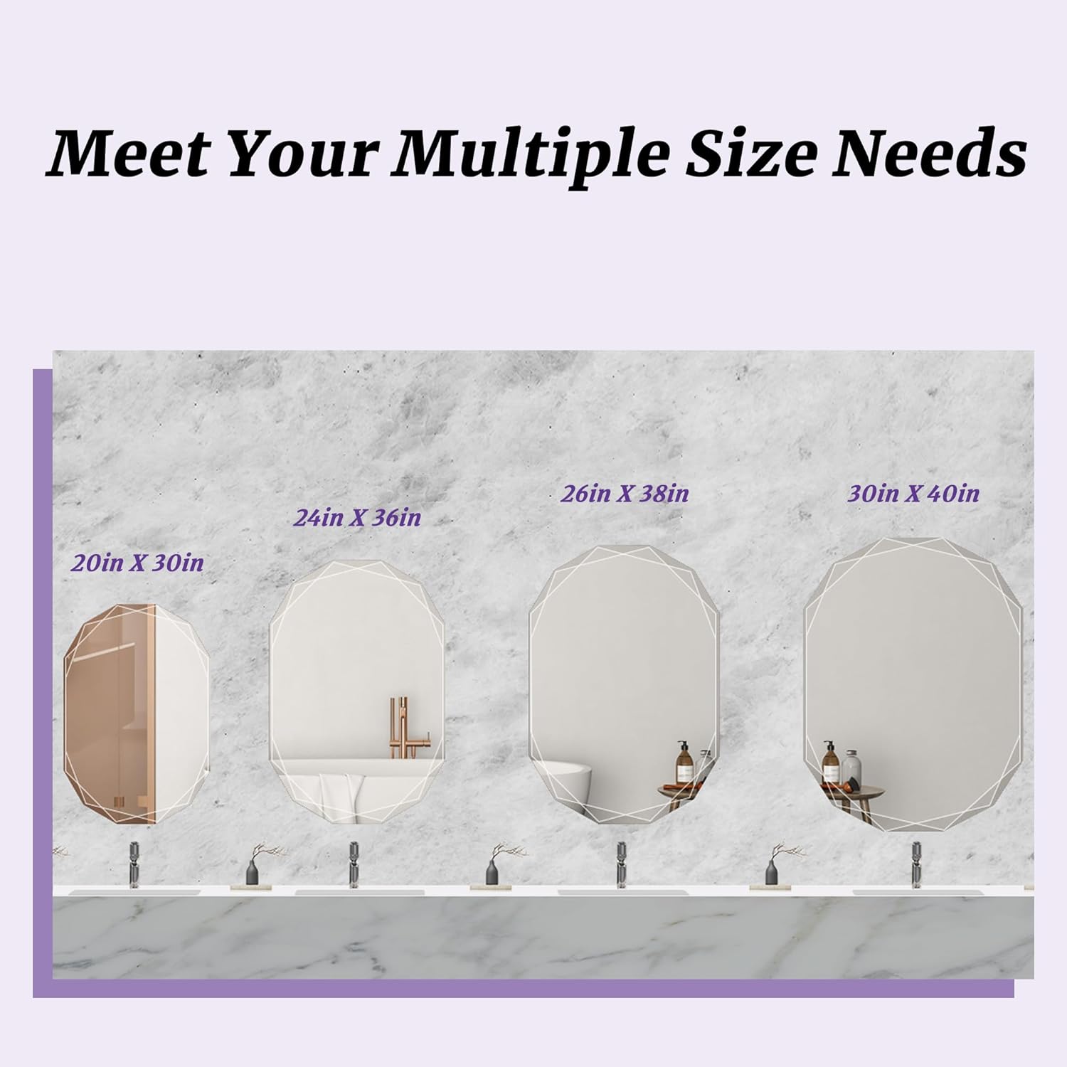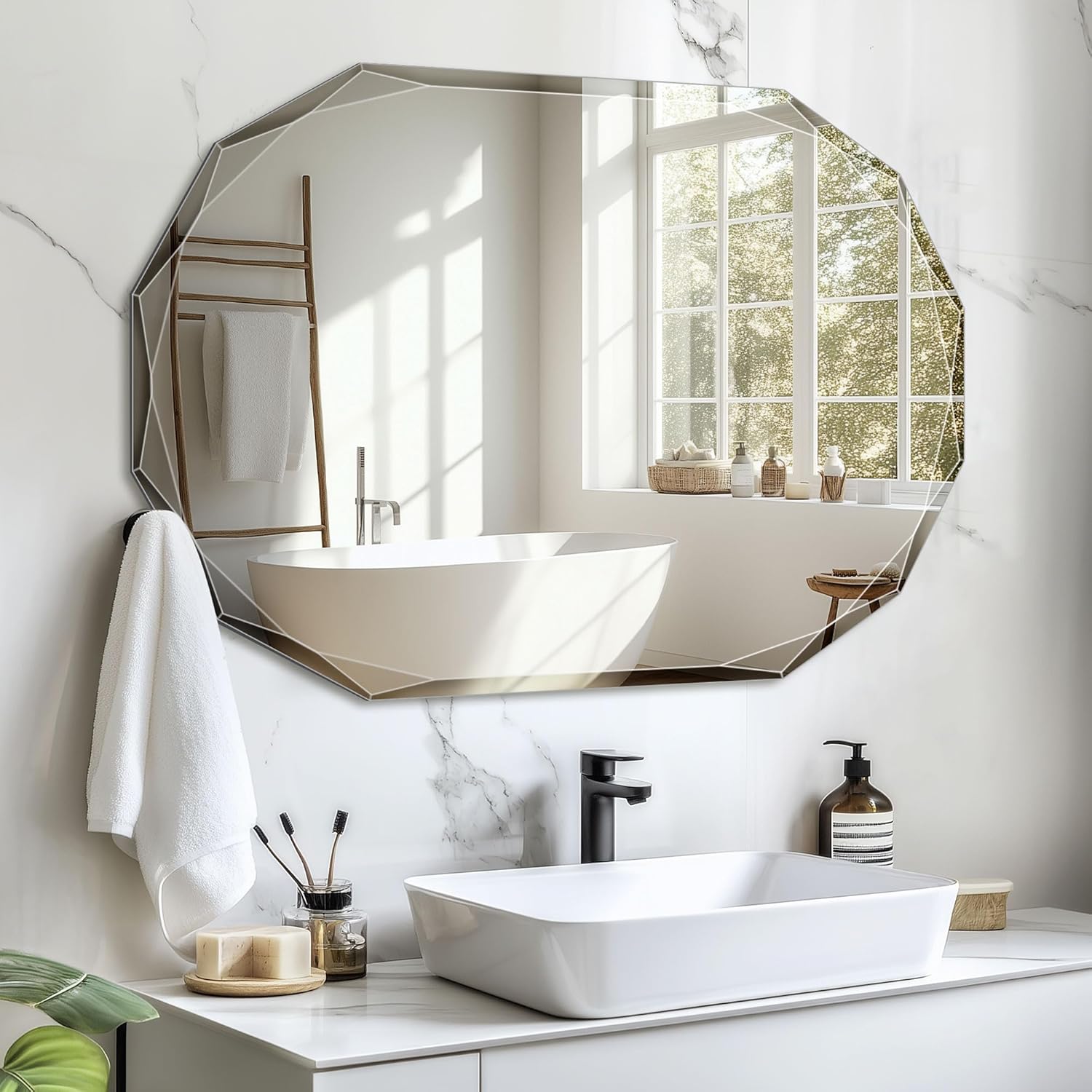 - Wall Mirror: Enhance your bathroom with the beveled edge bathroom mirror. Featuring a sophisticated diamond-cut bevel design, this mirror adds depth and dimension to any space, creating a modern and luxurious atmosphere