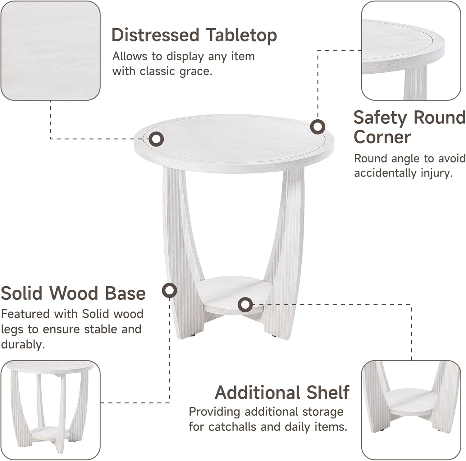 - â ăElegant Farmhouse Designă: This end table exudes rustic charm with a contemporary twist, featuring a white distressed finish that complements the farmhouse aesthetic. The vertical striped design on the solid legs adds a textural element that is both visually appealing and sophisticated.