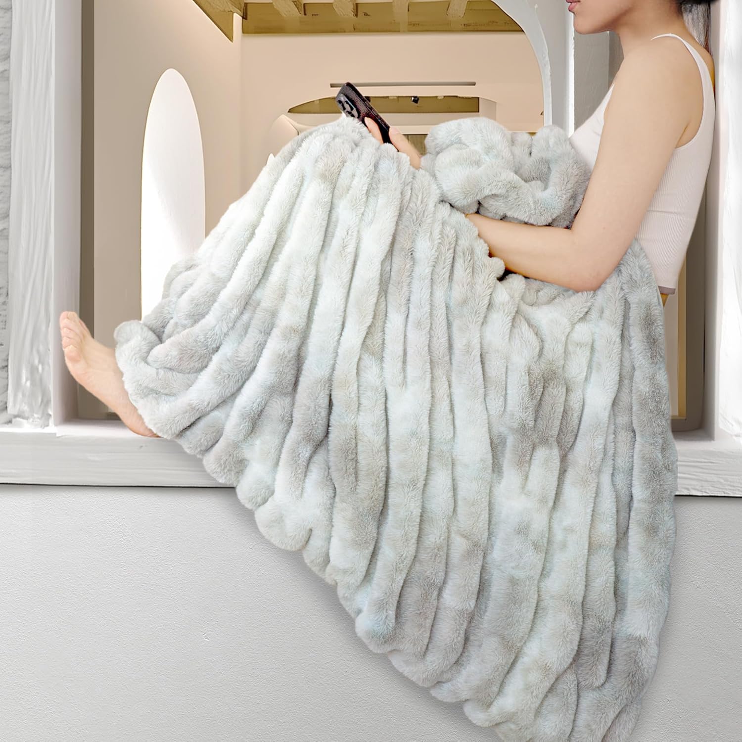 Faux Fur Blanket, Throw Blanket for Couch, Fluffy Blanket with Stretch Ruched Design, Ultra Soft Giftable Home Decor, 50x60 inches, Tie-Dyed in White and Gray