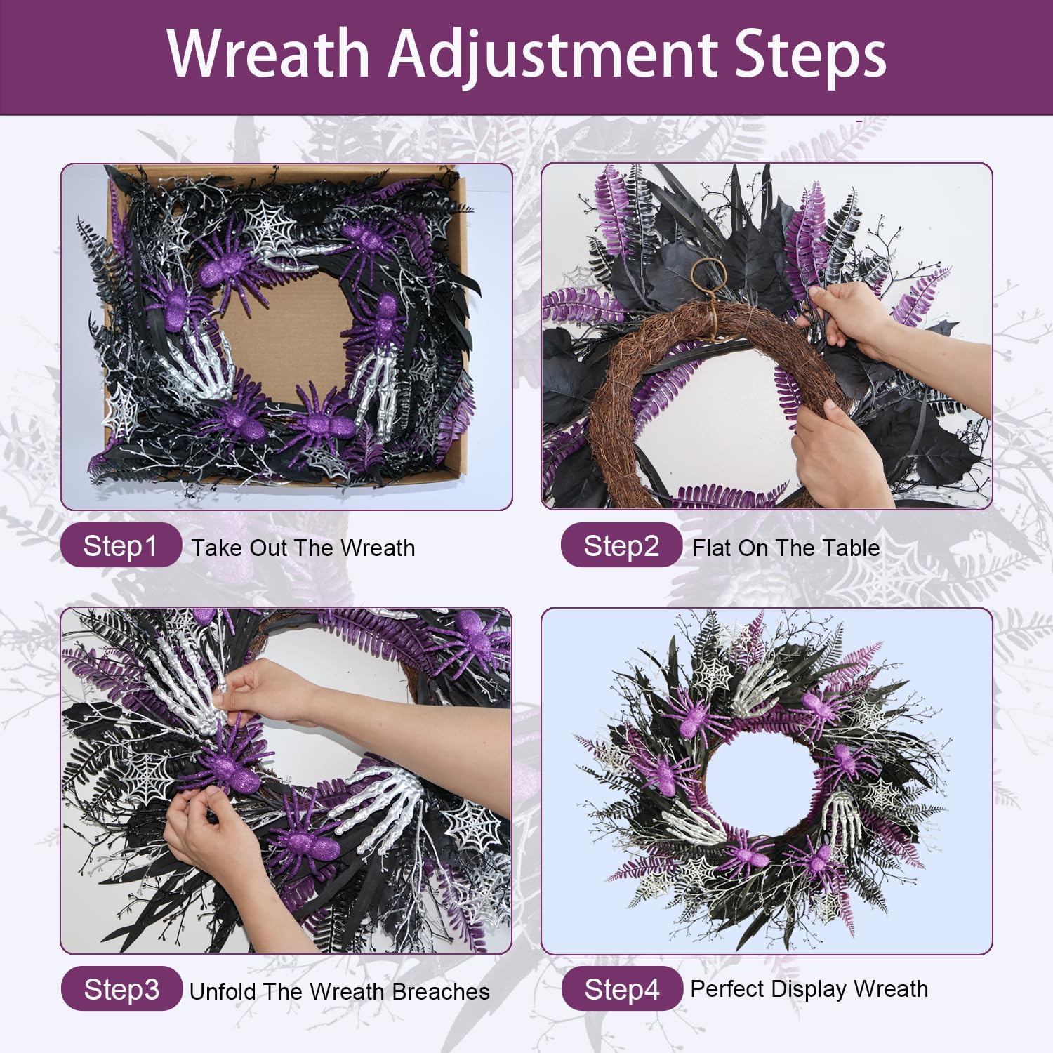 - š Festive Halloween Wreath: Celebrate Halloween with this 20-inch wreath adorned with black & purple leaves, purple Spiders Silver Skeleton Hands, creating a gothic and spooky ambiance.
