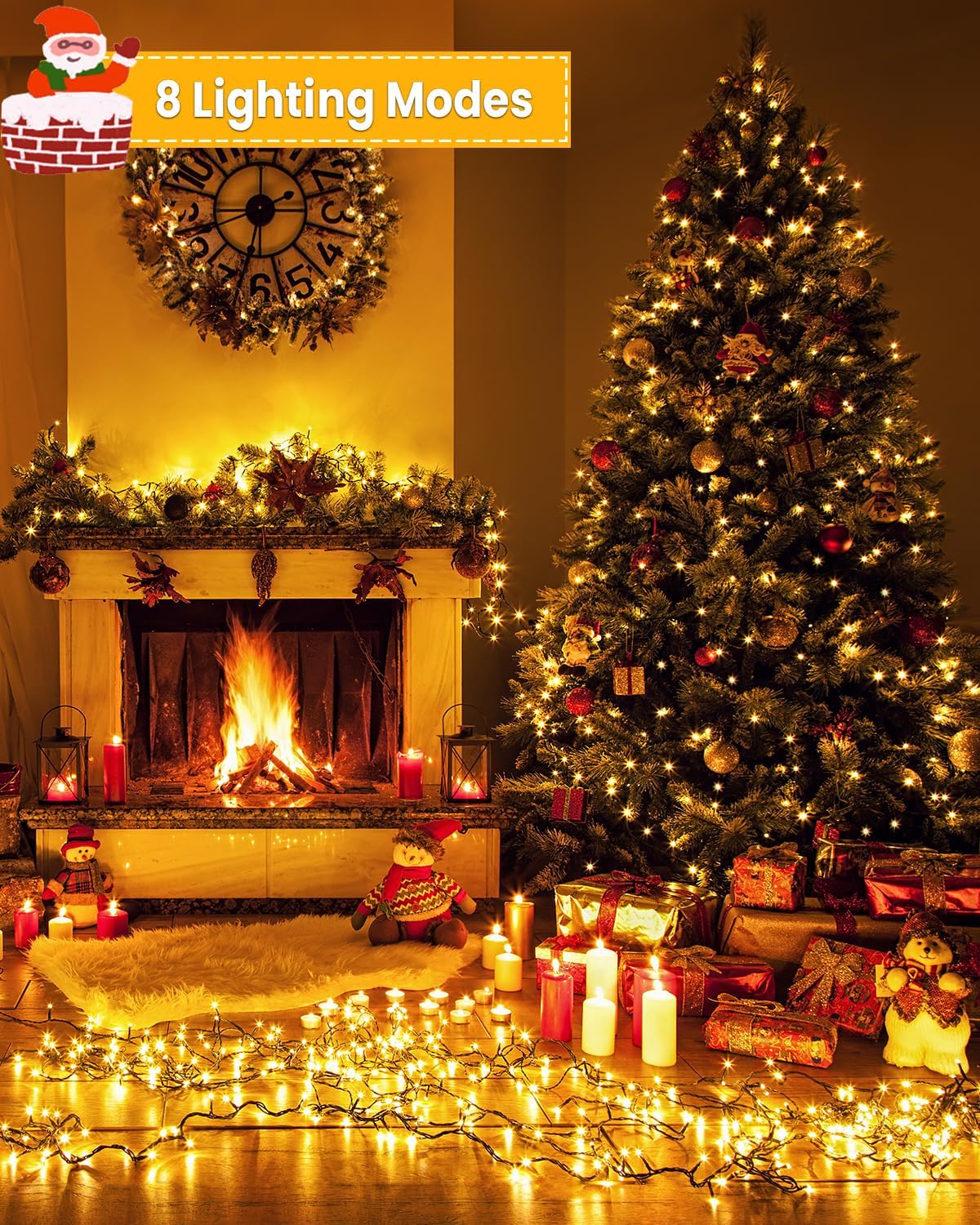 - 8 Lighting Modes & Dimming Function: Our Christmas lights indoor have 8 lighting modes: Steady On, Combination, In Waves, Sequential, Slo-Glo, Chasing/Flash, Slow Fade, and Twinkle/Flash. You can switch freely according to the occasion and mood. In addition, Warm White Christmas lights have 100%-75%-50%-25% 4-level adjust brightness, you can switch the brightness that make you feel the most comfortable