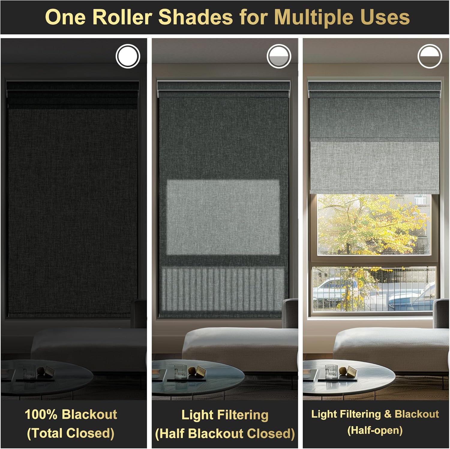 - MULTI-PURPOSE SHADE:Dual roller shades consisting of blackout and light filtering shades, blackout roller shade can 100% blackout,thermal insulation and UV Protection,so that you can experience quiet and comfort of the night during daytime;Light filtering roller shade allow light to filter into your room,and no glare,soft diffused light allow for perfect balance of light and darkness,and also enhances overall aesthetics of your home,allowing for a romantic and comfortable living environment.