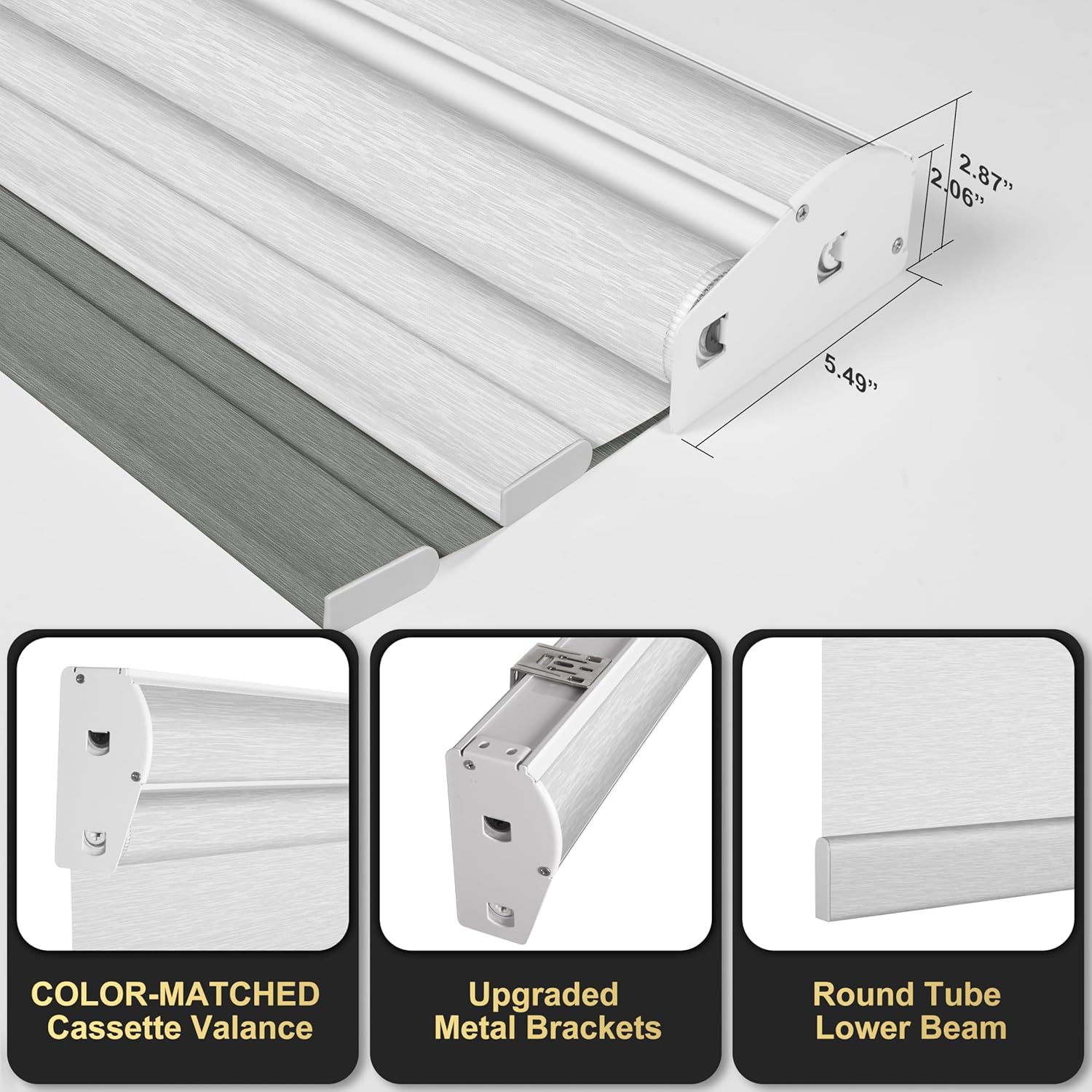 - FREE STOP CORDLESS SYSTEM:The cordless double roller shade prioritizes safety with a cordless design designed for families with small children or pets.You just need to pull down or push up to stop at any position you want. COLOR-MATCHED CASSETTE VALANCE:The hidden installation of the cordless roller blinds can effectively reduce installation gaps, reduce light leakage.The color of the cassette valance is same as the fabric color,making the day night blinds more beautiful after installation.