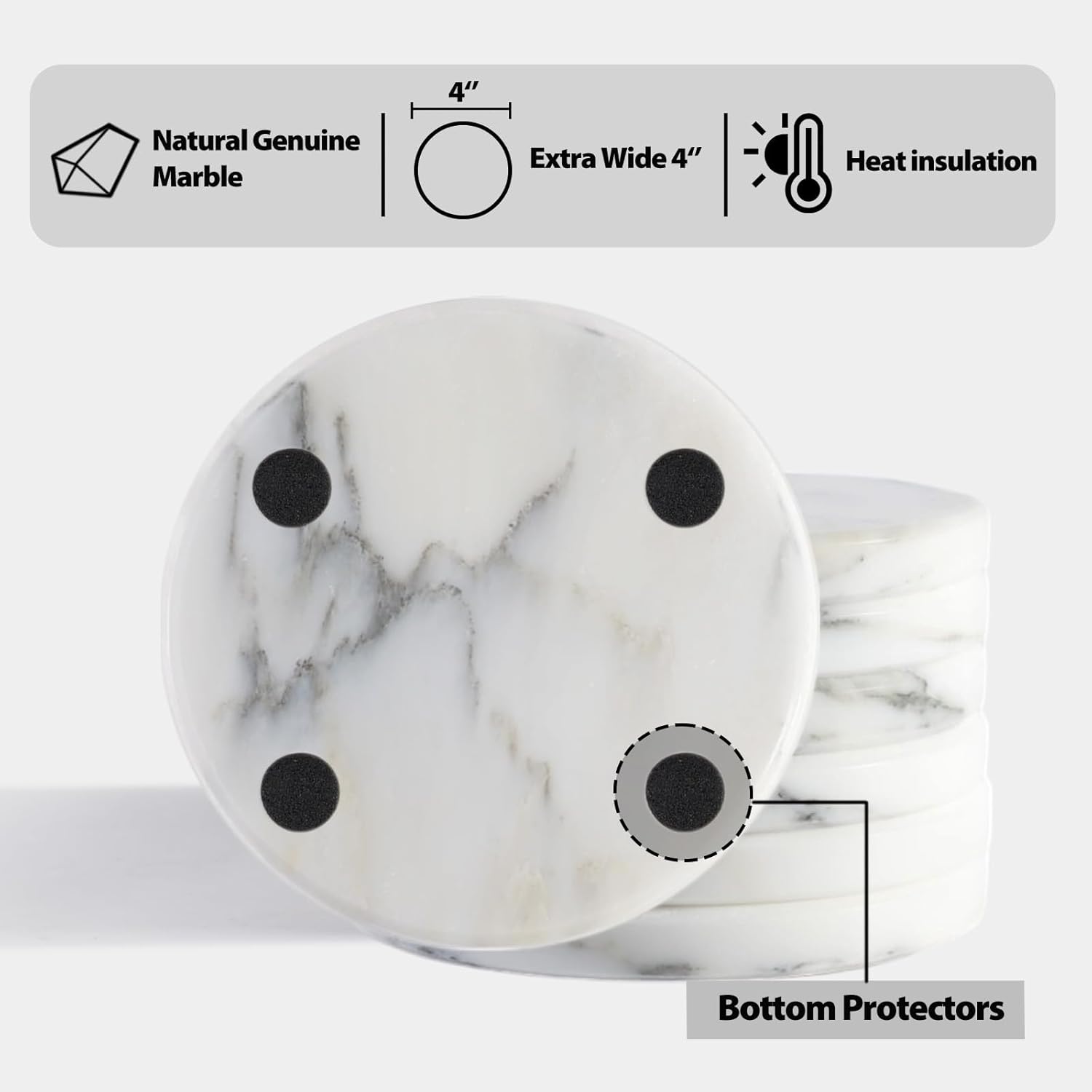 - Protect Tabletop ---- Each marble coaster has bottom protectors that can provide tabletop protection of your table or desk, such if soiled and scratched, just enjoy your drinks without worrying too much