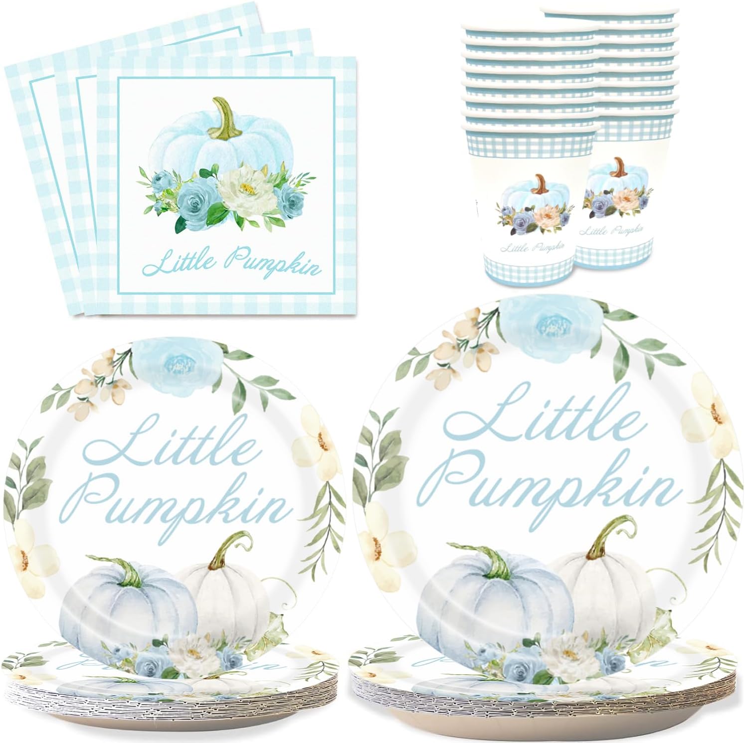 Aukolass Pumpkin Party Supplies Tableware Set - Fall Theme Party Decorations Including Plates, Napkins and Cups for Pumpkin Birthday and Baby Shower Party, Serves 24 Guests (blue)