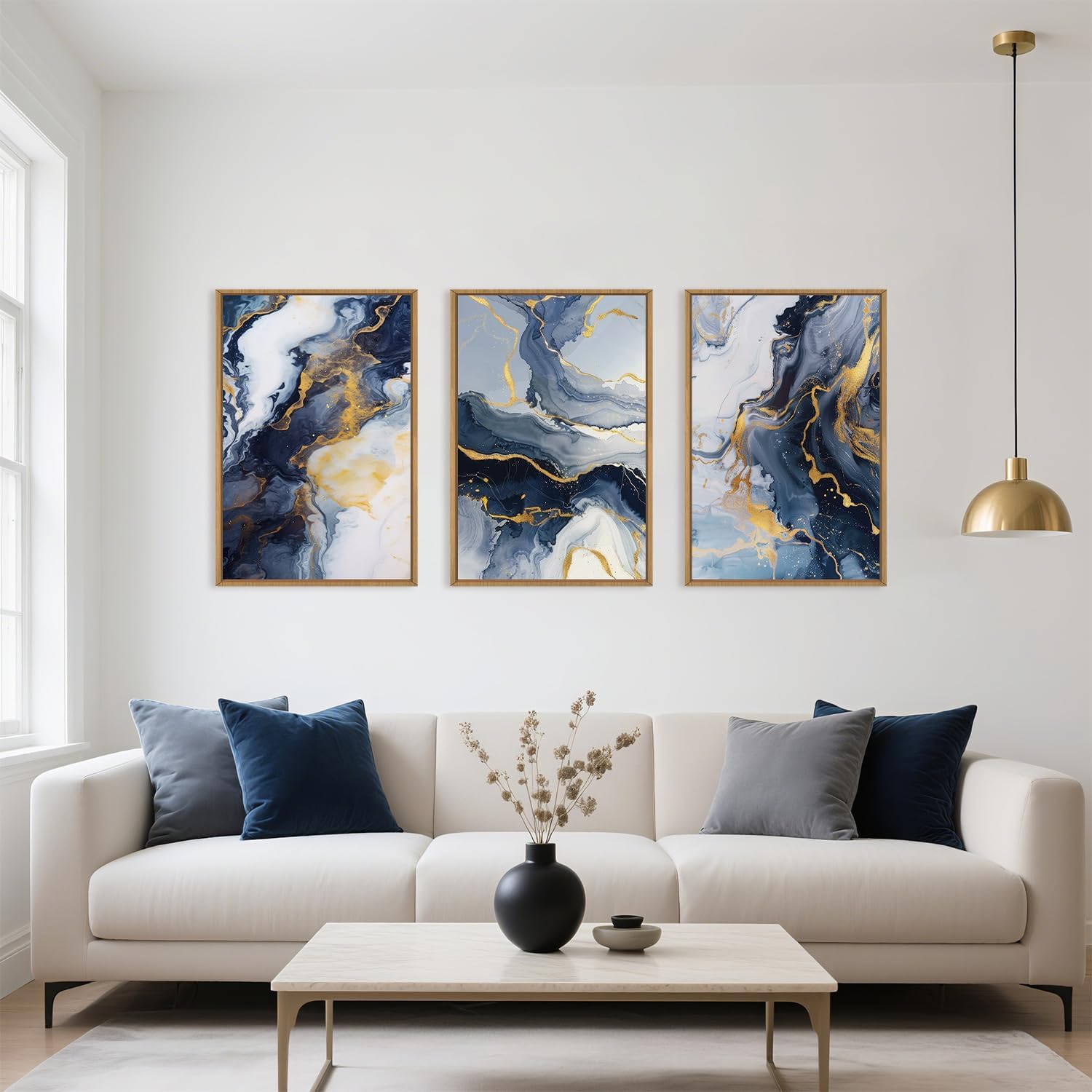 Blue and Gold Framed Canvas Wall Art Set, Mid-Century Modern Abstract Wall Decor, Navy Blue Ink Wash Painting, Neutral Art Print for Living Room, Bedroom, Dining Room, Office - 16"x24"x3