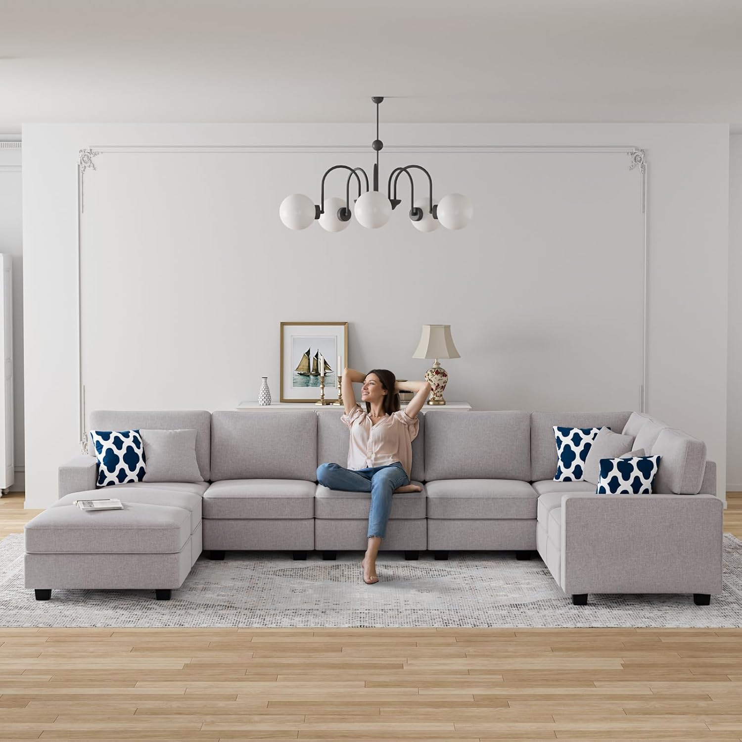 - 【Ergonomic Design】The backrest of the couches for living room perfectly fits the human body curve, the armrests are wide and at the right height, and the living room sofa as a whole is ergonomically designed to give you comfortable support. The modular sectional sofa is paired with multiple multi-functional small pillows, allowing you to relax anytime, anywhere. The oversized couch has a weight capacity of up to 660 pounds to give you stable support.