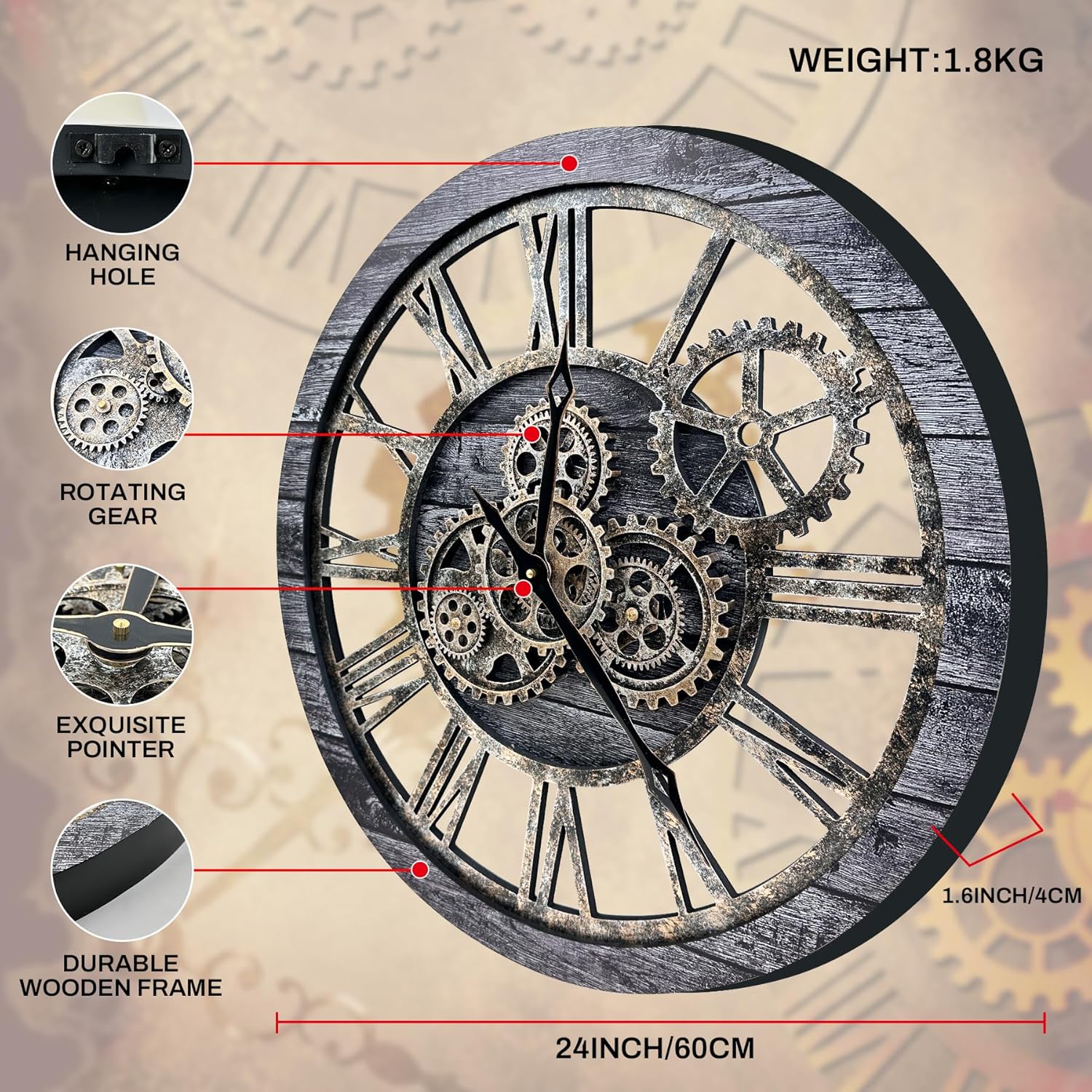 - REAL MOVING GEARS: Large wall clock with unique moving parts is as attractive as it is functional. Put batteries in, various gears start rotating fluently. Moving gear wall clock is amazing looking on the wall and will get so many compliments on it. Made from solid wood and painted by Rust-like color on wall clock create a very rustic and industrial atmosphere. Farmhouse wall clock is professionally handmade and pursuit of naturalness, so it may have some little imperfections.