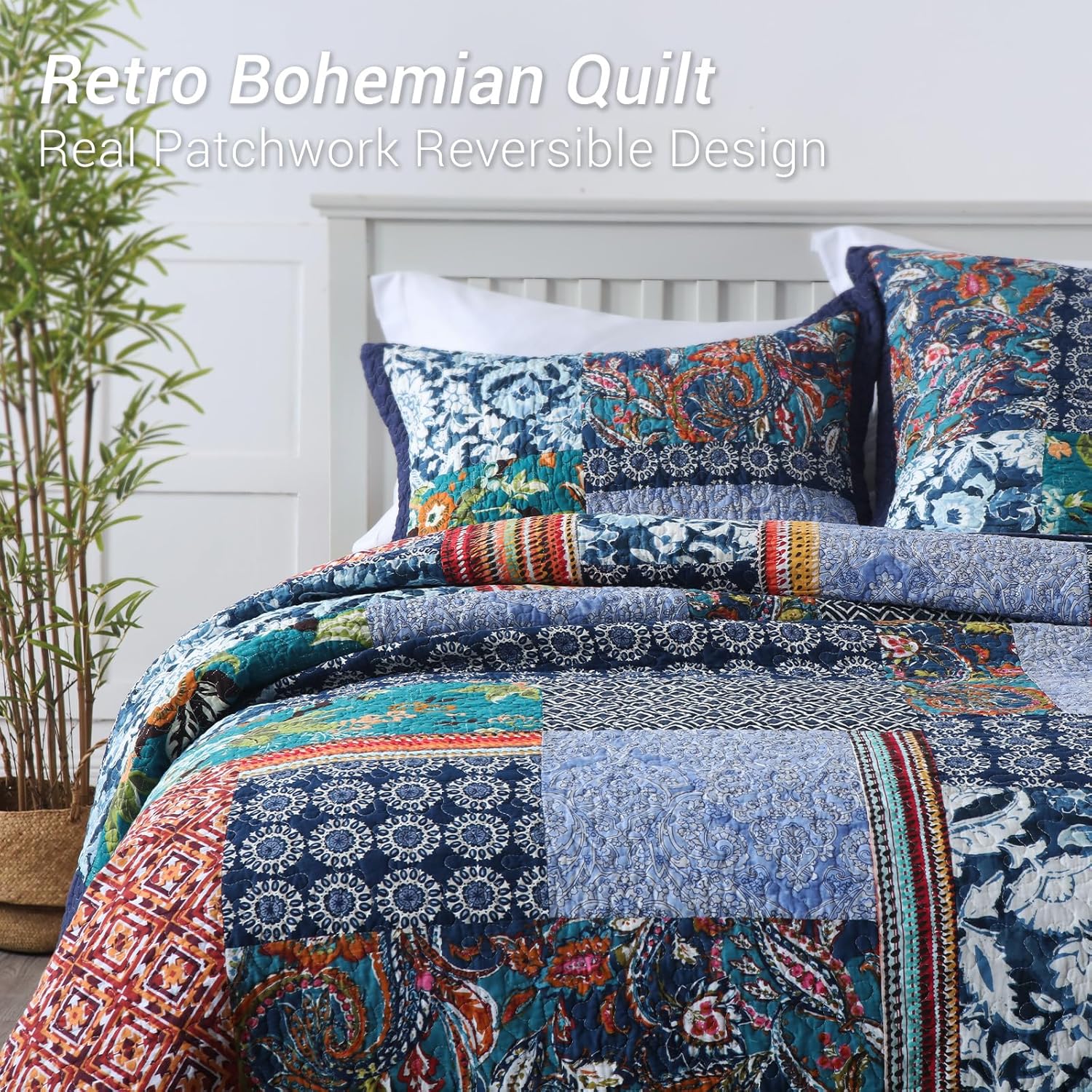 - REVERSIBLE UNIQUE REAL PATCHWORK DESIGN: The real patchwork quilt set is made of different patterns pieces sewn together. The quilt set is reversible design; its A side is designed with bohemian paisley patchwork and its B side with classic medallion. The special bohemian design fits for any decoration and will brighten your room. It is a great choice to send it to your families and friends.