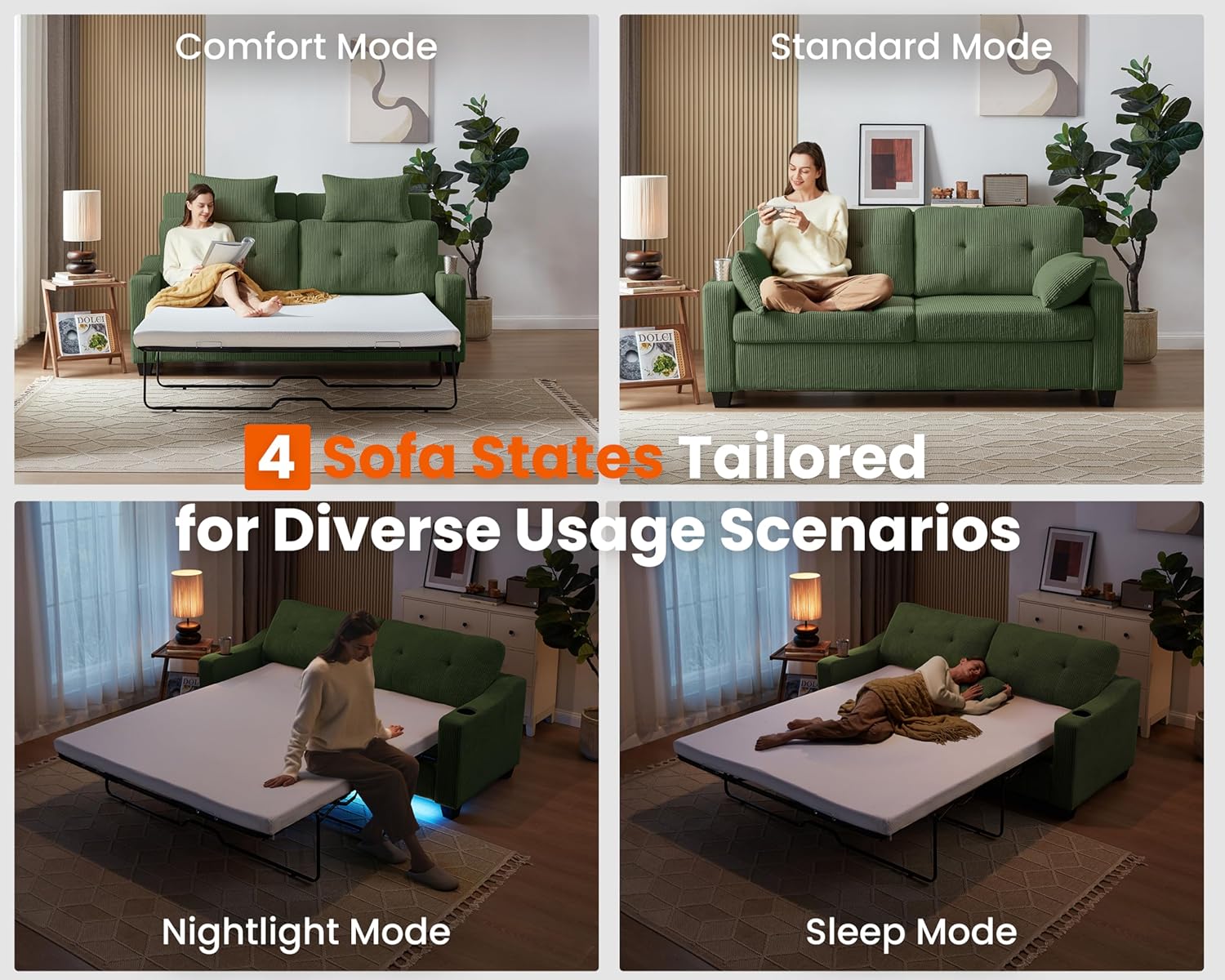 - 【Four Sofa States for Various Scenarios】Our sofa bed supports four different configurations to meet your varying needs. It operates in a standard mode for daily use; by adjusting it as shown in our diagram, you enter the comfort mode, perfect for enjoying leisure time in bed; switch to the nightlight mode for easy nighttime standing; and the sleep mode optimally supports your sleeping needs