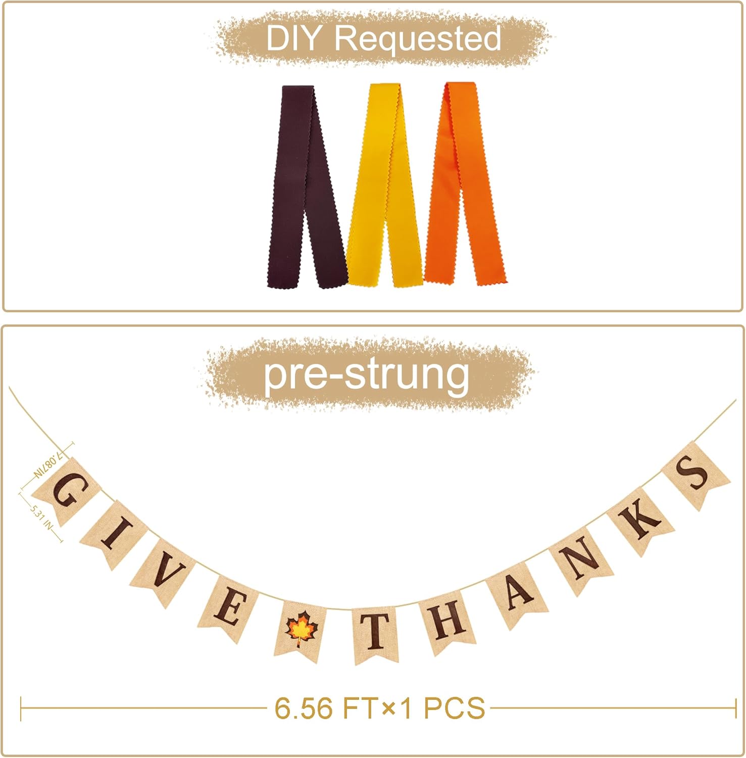 - Package Contains - 1 string of give thanks maple leaf burlap garland banner,Size of each flag is 5.31 x 7.08 inch. 1 set of fall color fabric ribbon.